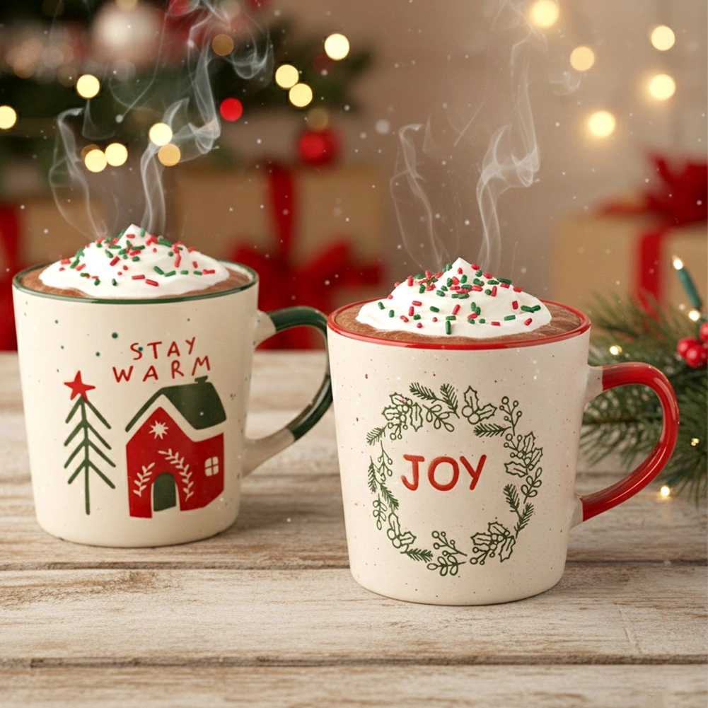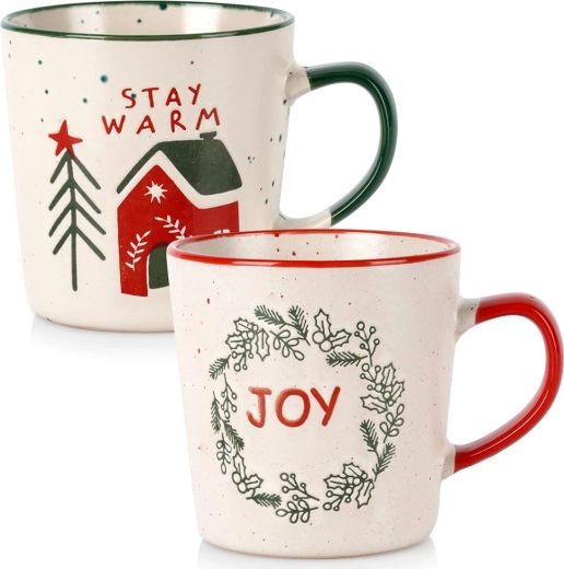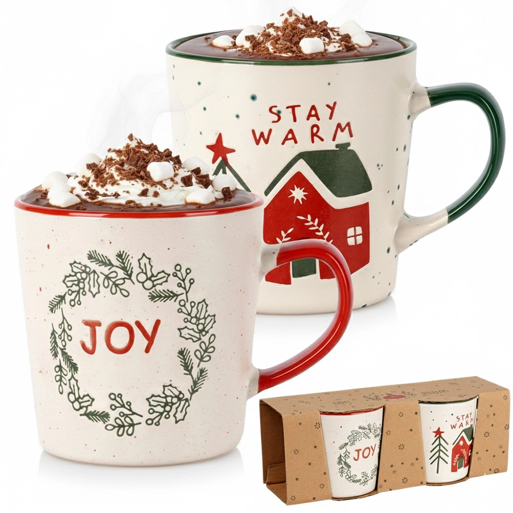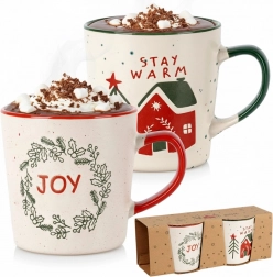 Krusene prydes af fine, festlige motiver med teksterne JOY og STAY WARM samt kontrasterende farvedetaljer i rød og grøn. Hele sættet er anbragt i en æstetisk gaveæske, hvilket gør det til et fremragende gaveidé til familie eller venner. Den praktiske anvendelse fuldendes af muligheden for opvask i maskine og opvarmning i mikroovn.