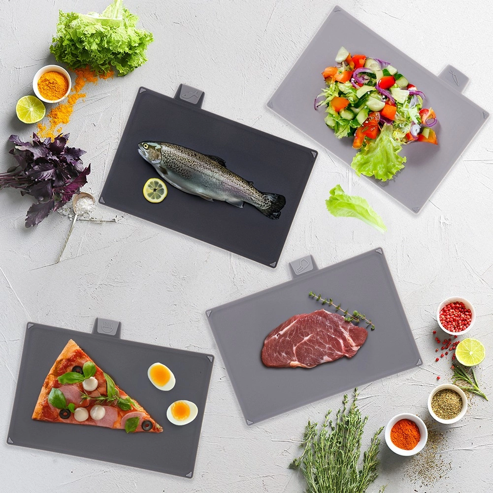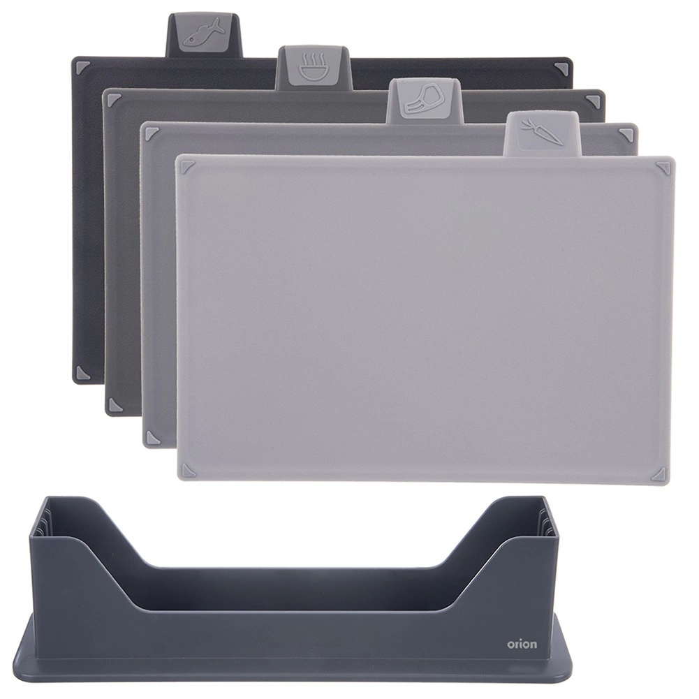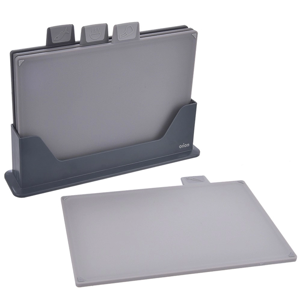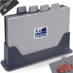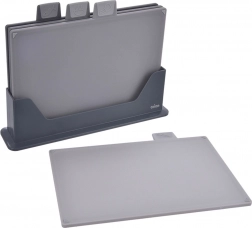 Dette sæt med 4 brætter i grå nuancer er designet til daglig madlavning med fokus på hygiejne og organisering. Grafiske mærker på de øverste faner angiver tydeligt brug til grøntsager, råt kød, færdige retter og fisk, så du nemt bevarer renhed og orden under madforberedelsen.
