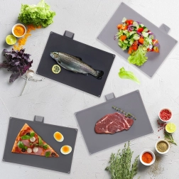 Fire brætter med ikoner til fisk, kød, grøntsager og varme retter hjælper med at forhindre krydskontaminering og gør madforberedelsen overskuelig.