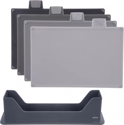 Det kompakte stativ med formede riller holder brætterne oprejst, har skumpuder mod at glide og beskytter køkkenbordet mod ridser.