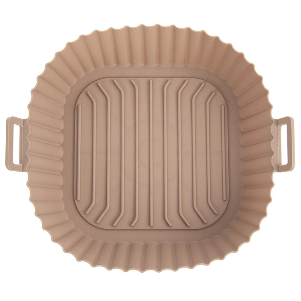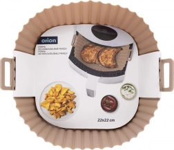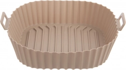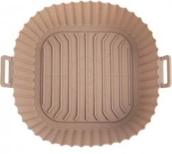 Beige silikoneindsats til airfryer med mål 22 × 22 × 7 cm (bund 18 × 18 cm) beskytter indersiden af frituren mod madrester og gør vedligeholdelse enklere. Den non-stick overflade forhindrer fastbrænding, og takket være de integrerede håndtag er indsatsen let at sætte i og tage ud.