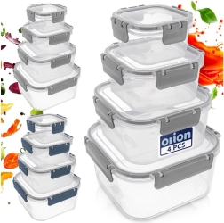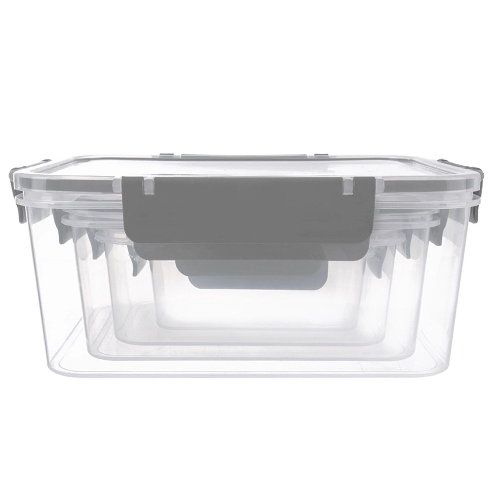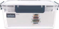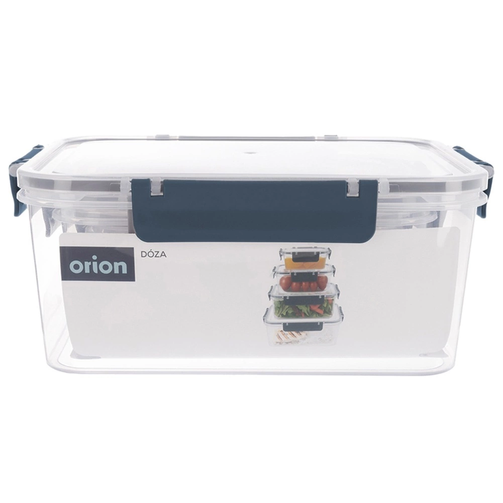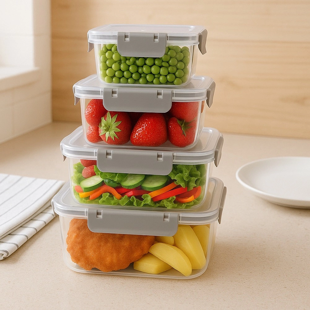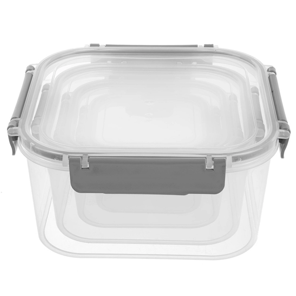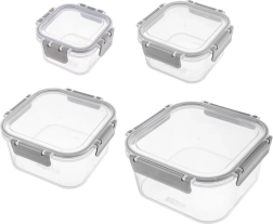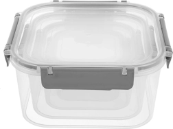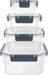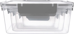 Sættet indeholder fire firkantede bokse med kapacitet på 400 ml, 900 ml, 1,8 l og 2,9 l. Takket være det gennemsigtige korpus ser du altid hurtigt indholdet, mens silikonepakningen og de fire solide clips sikrer en pålidelig, tæt lukning uden lækager. Mindre bokse kan lægges i den største, så de optager minimalt med plads i skabet.