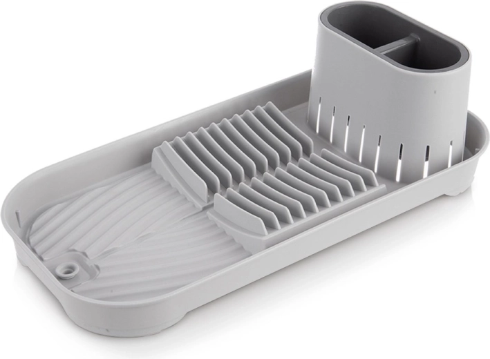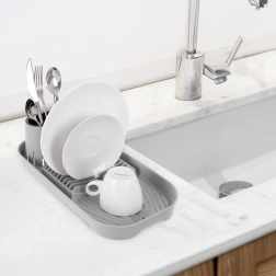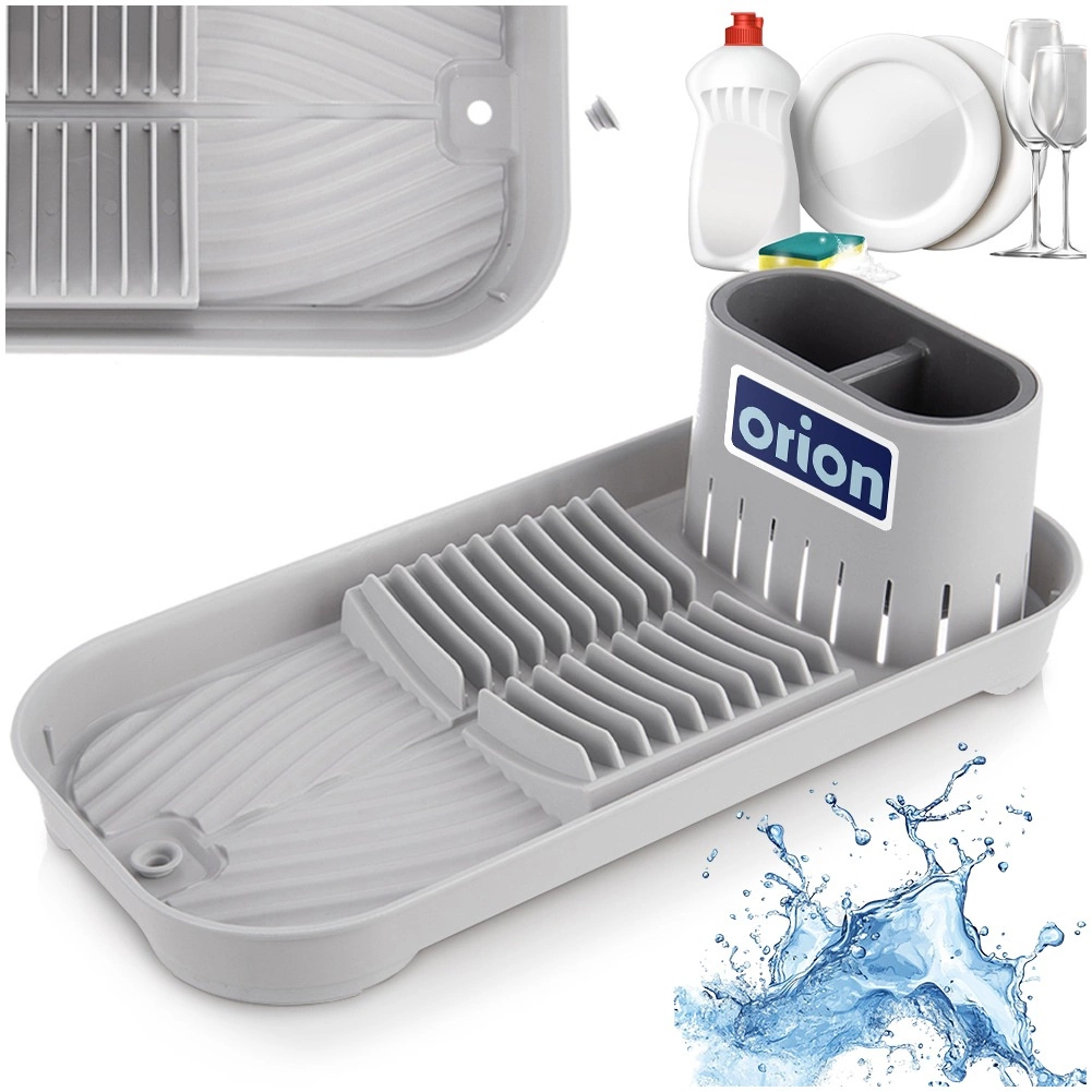 Holder til tallerkener, plads til krus og en aftagelig bestikkurv med to rum. Ideel til små køkkener, lejligheder og campingvogne.
