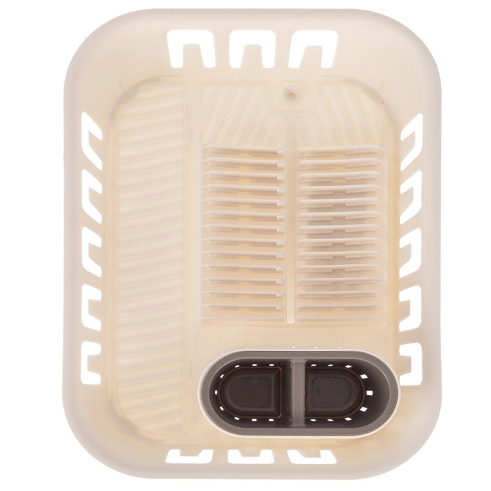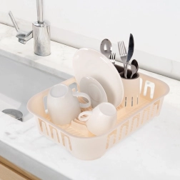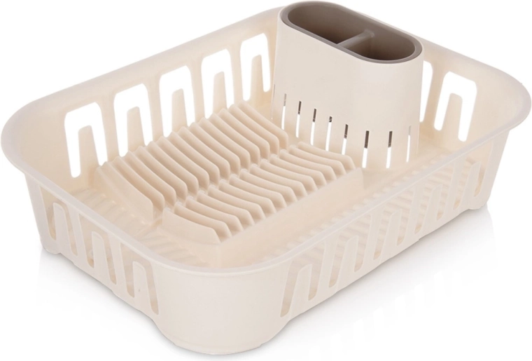 Den aftagelige bestikholder med to rum gør det nemt at sortere gafler, knive og skeer. Drypbakken er lavet af holdbar plast, og bunden har riller for hurtig afløb af vand. Silikoneelementer på undersiden sikrer tryghed og skridsikker stabilitet i daglig brug.
