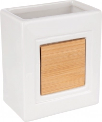 Blank hvid overflade med bambuspanel virker elegant og holder tandbørster og småting lige ved hånden.
