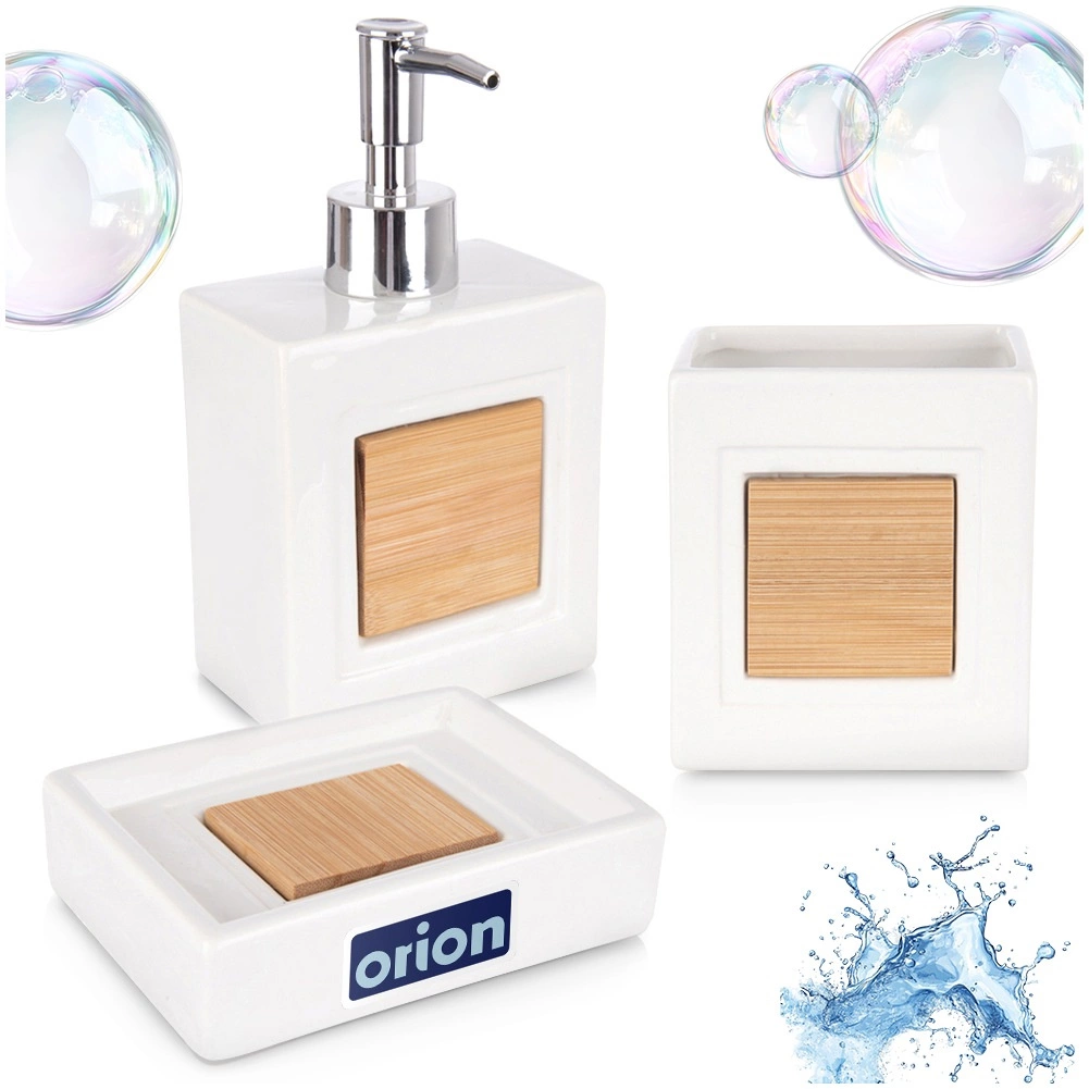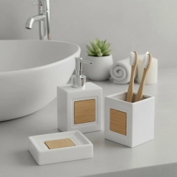 Sættet består af en dispenser til flydende sæbe med præcis dosering, et krus til tandbørster eller kosmetiske tilbehør og en sæbeskål til hygiejnisk opbevaring af fast sæbe. Ideelt til både badeværelse og toilet – hjælper med at holde orden og et elegant look.