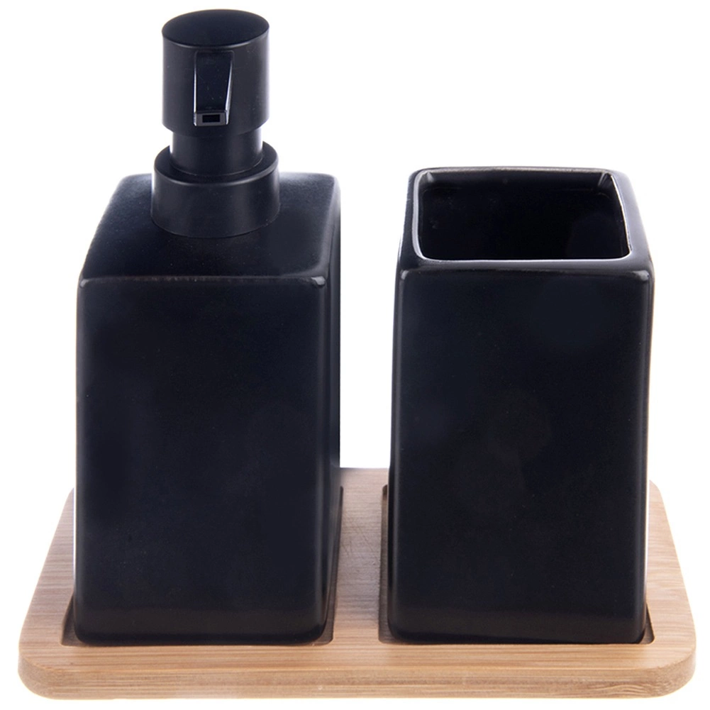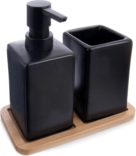 Oplev kombinationen af funktionalitet og æstetik: sort dolomit med mat finish og naturlig bambus danner en tidløs accent til både moderne og klassiske interiører. Sættet hjælper med at holde et rent og overskueligt område ved håndvasken – alt har sin plads og er lige ved hånden.