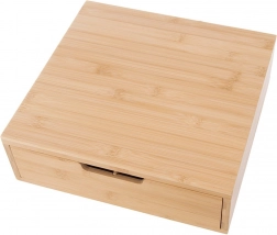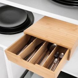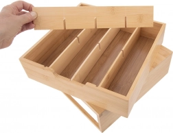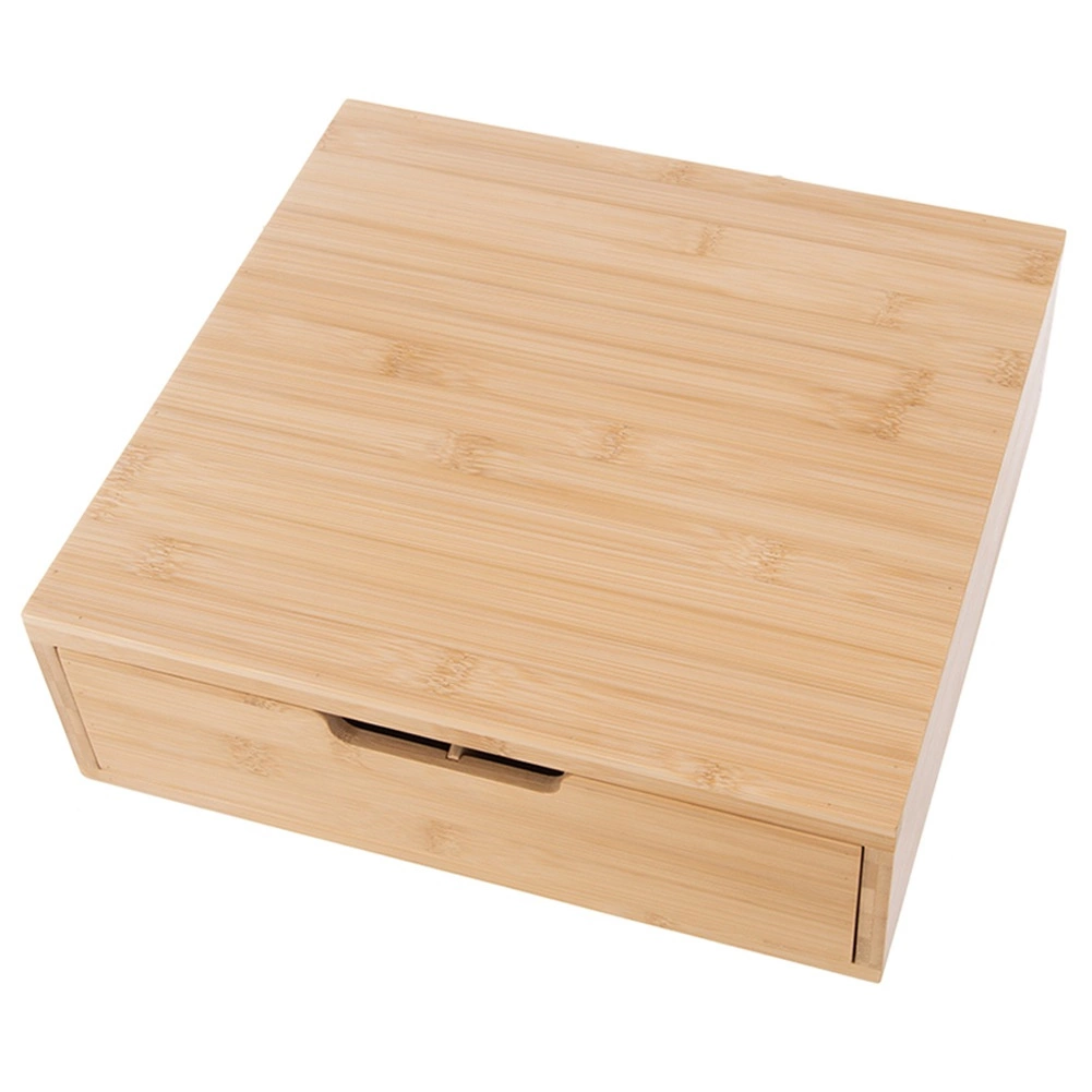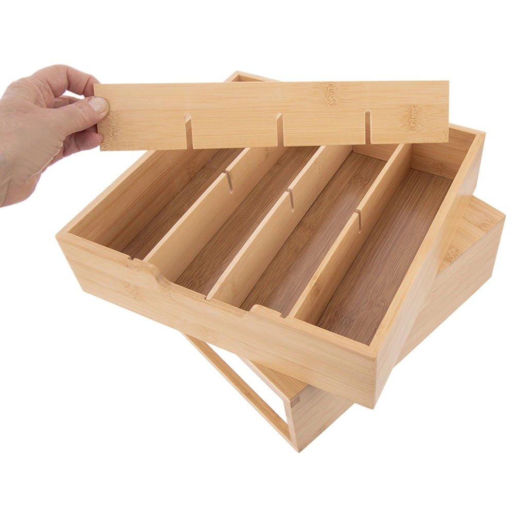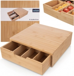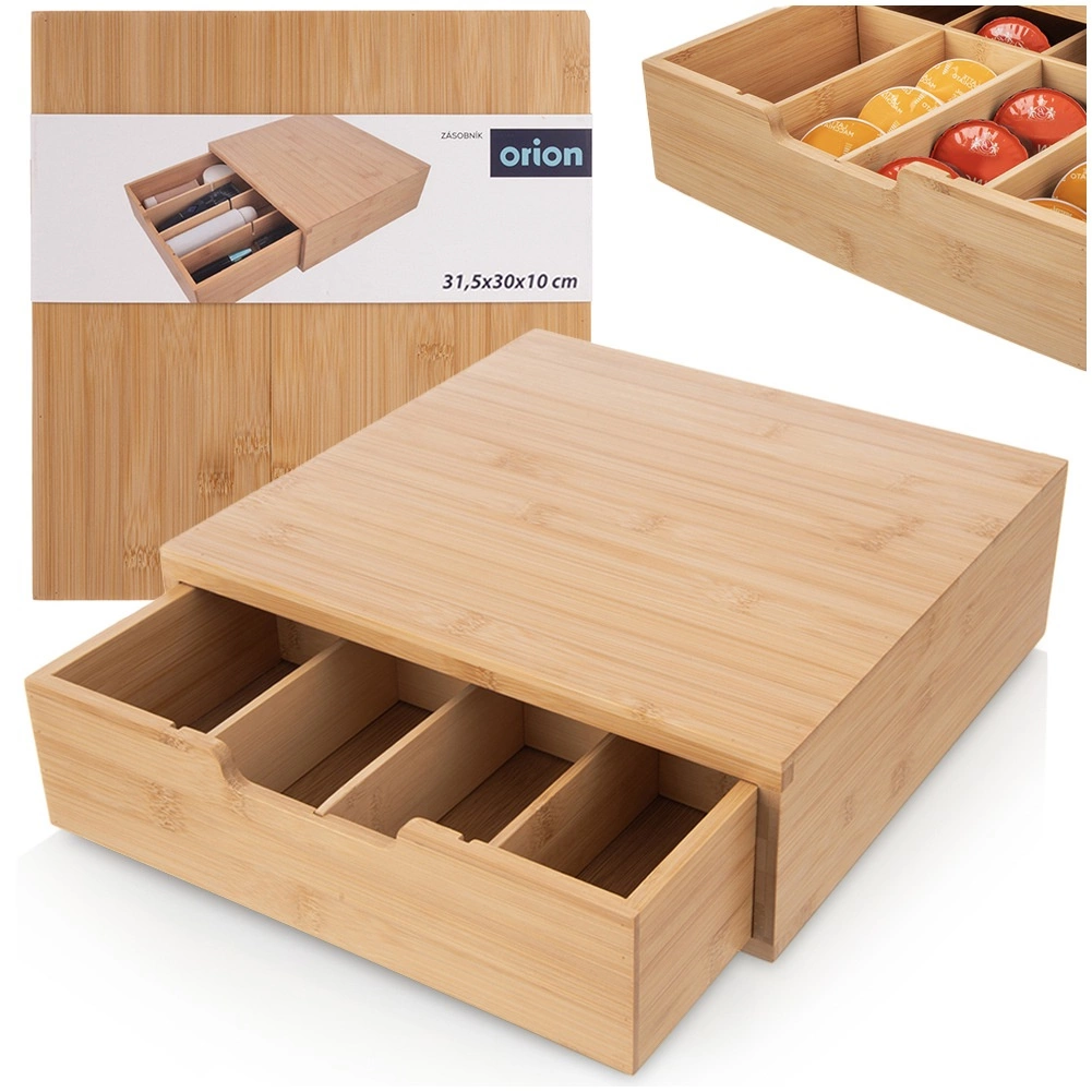 Elegant organisator i naturlig bambus, der kombinerer et stilrent udseende med funktionel indretning. Skuffen med skillevægge gør det nemt at sortere kapsler, tebreve, krydderier og andre småting. Tilpas den indvendige inddeling med aftagelige elementer præcis efter dine behov.