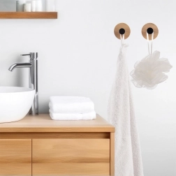 Sættet med 2 selvklæbende kroge er en smart løsning til overskuelig opbevaring af håndklæder, morgenkåber, viskestykker, tasker og tilbehør. Naturlig bambus kombineret med sort metal skaber et tidløst, minimalistisk udtryk, der passer til både moderne og skandinaviske interiører. Montering uden værktøj sparer tid, vægge og fliser.