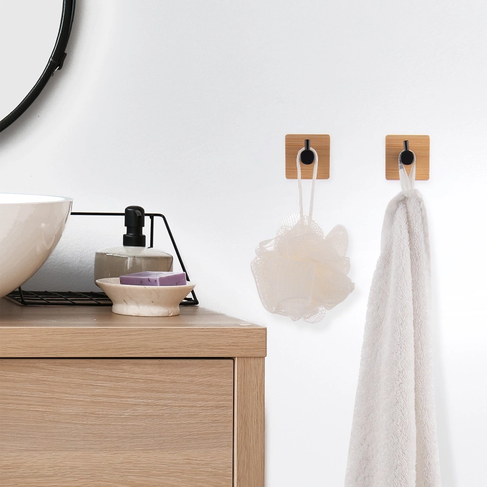 Stilfulde kroge med bambusbase og sort metalknop er designet til daglig bekvemmelighed. Takket være den selvklæbende bagside er installationen hurtig og ren – uden boring, støv og værktøj. Det minimalistiske design passer perfekt i både moderne og naturinspirerede interiører.