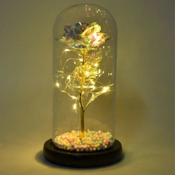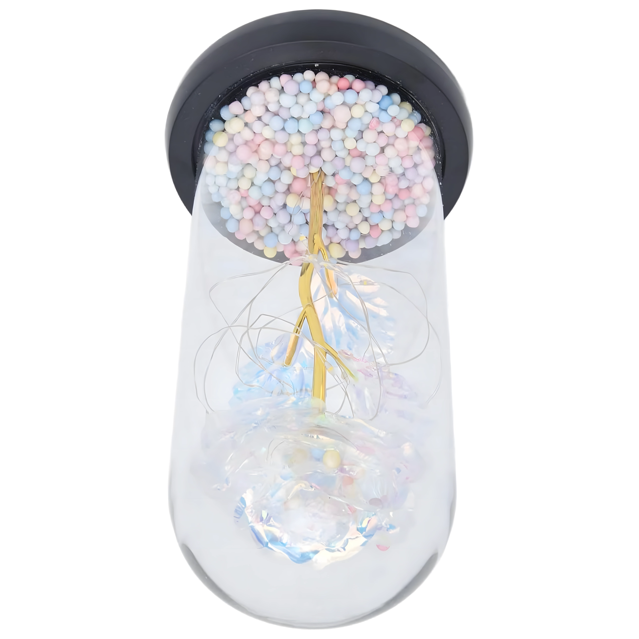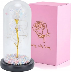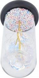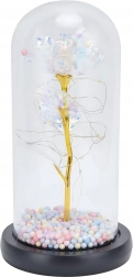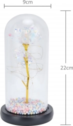 Denne hvide evighedsrose i kuppel er et symbol på tidløs kærlighed og stilrent design. Glaskuplen beskytter blomsternes fine detaljer, mens de små LED-tråde slynger sig om den gyldne stilk og skaber et varmt, ambient lys. Pastelfarvede perler i soklen giver dekorationen et legende præg.