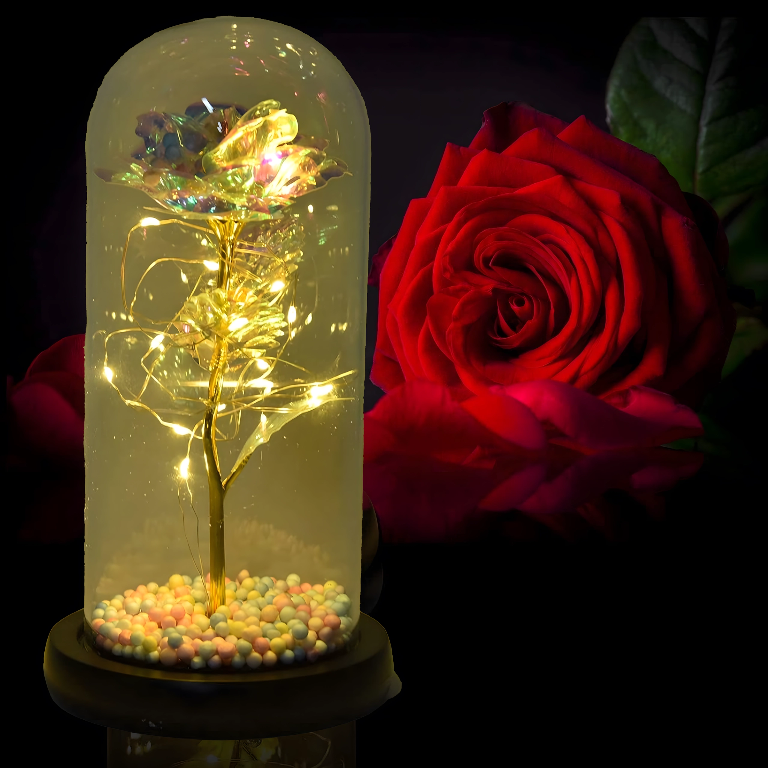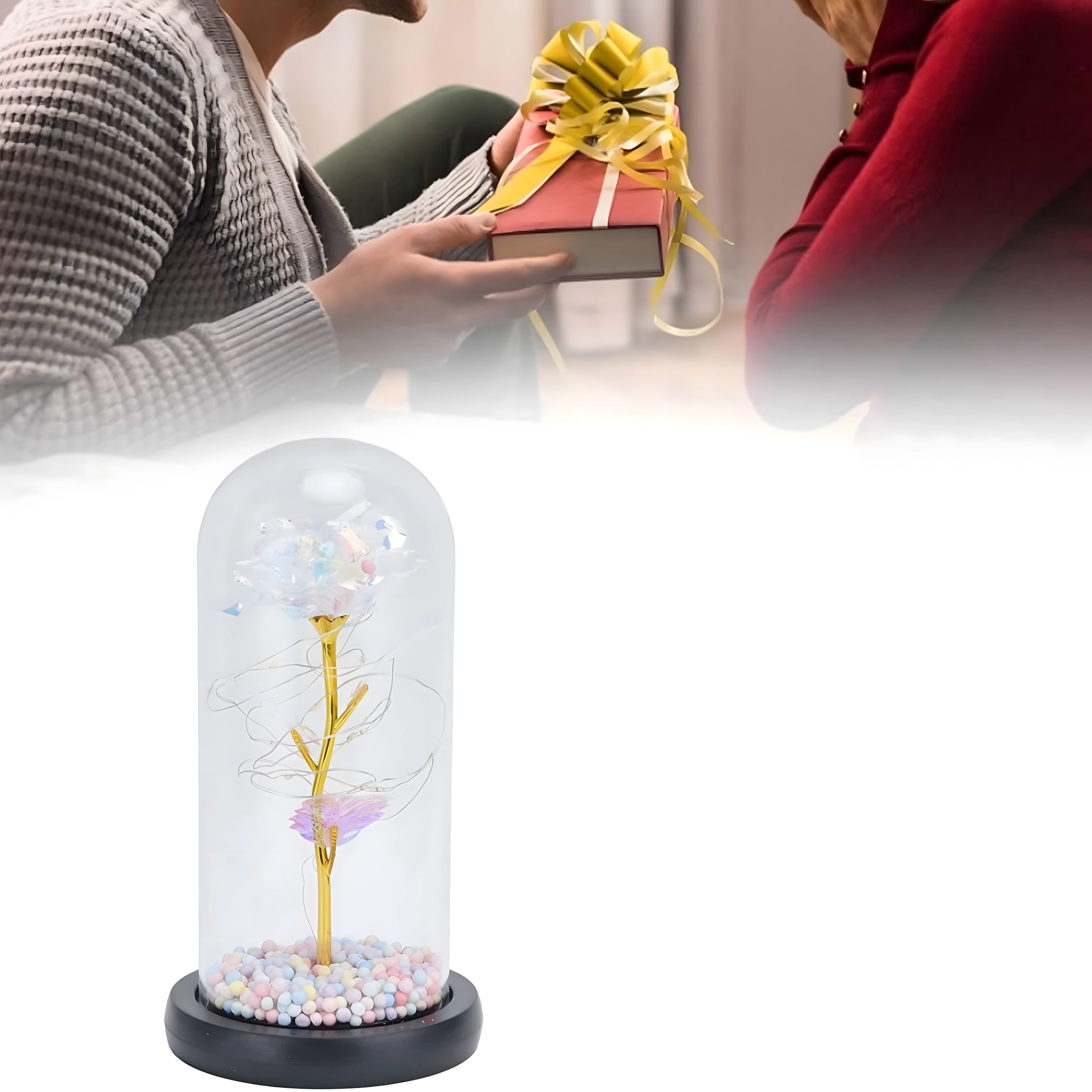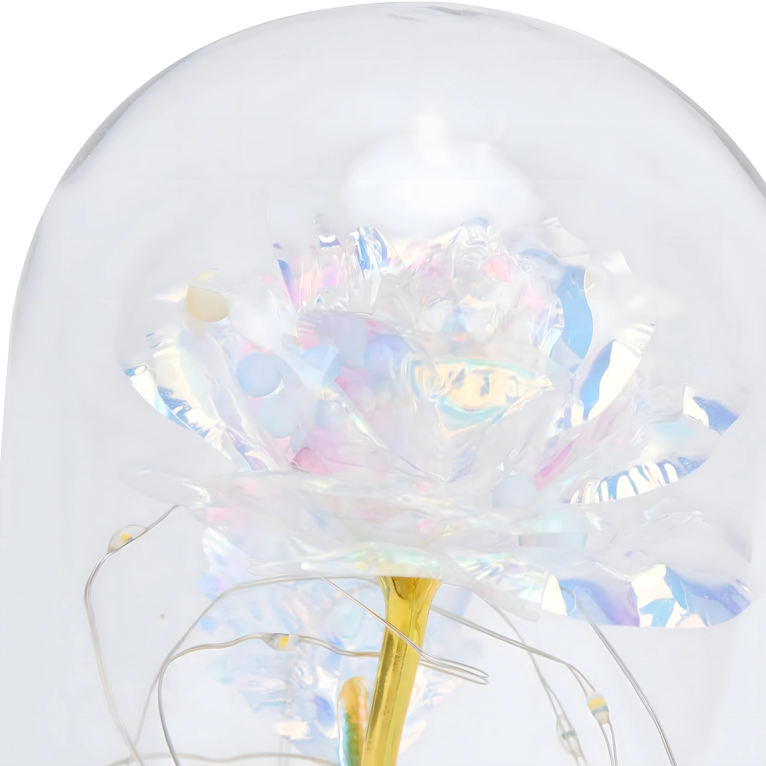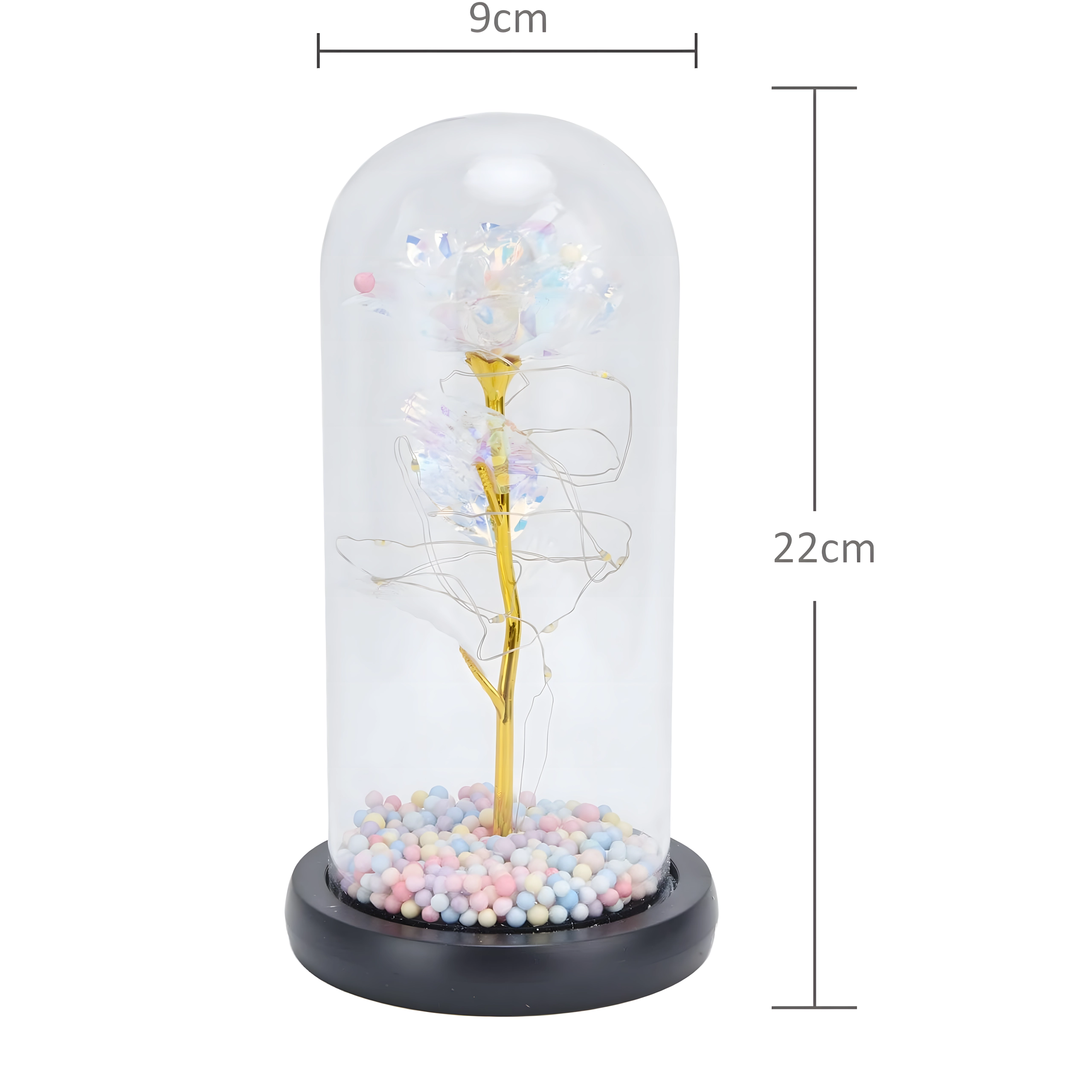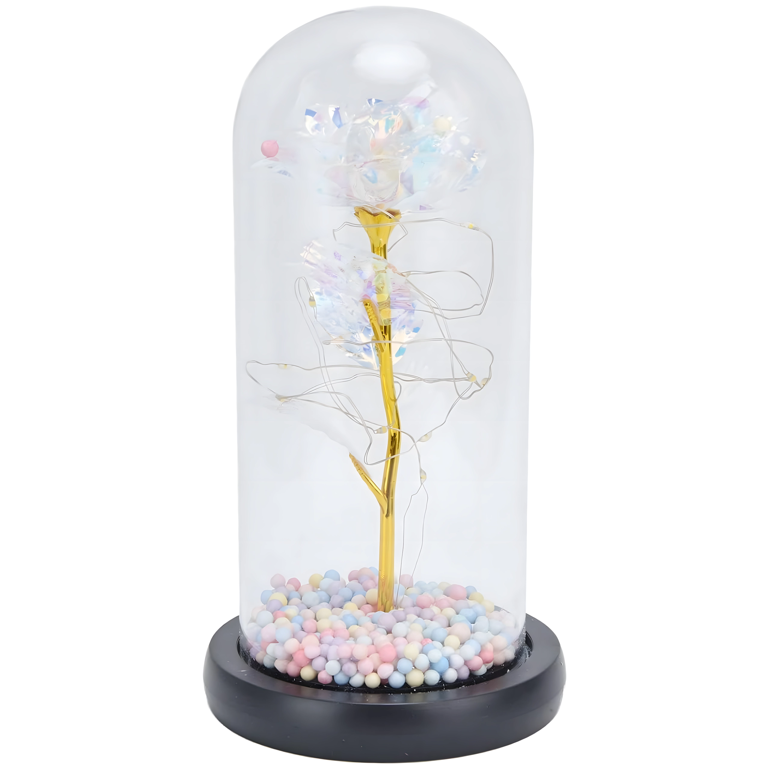 Den klare glaskuppel beskytter blomsten mod støv og fremhæver de funklende, iriserende kronblade – dekorationen stråler fra enhver vinkel.