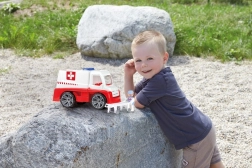 Åbningsbare bagdøre og opklappelig kabine giver realistiske lege-scenarier uden behov for batterier. Børn kan nemt tage båren ud og transportere patienten.