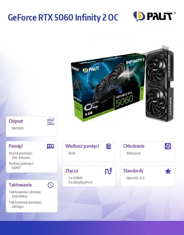 Palit GeForce RTX 5060 INFINITY 2 OC bygger på NVIDIAs moderne arkitektur og henvender sig til både gamere og skabere, der ønsker ydelse uden tuning. Det minimalistiske look med uendelighedsmotiv understøtter jævn luftstrøm og en ren æstetik, der passer i de fleste kabinetter.
