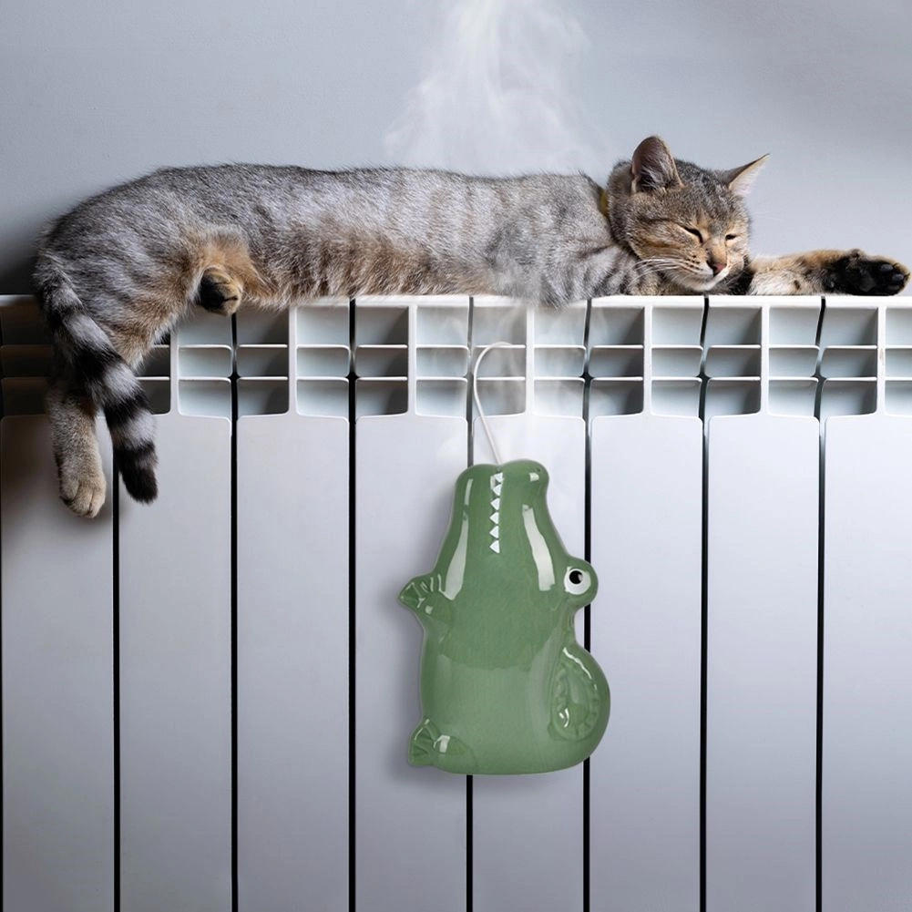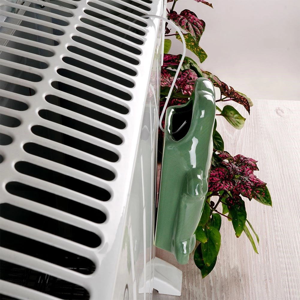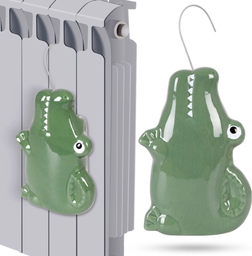 Slut med tør luft derhjemme på en stilfuld måde. Den keramiske radiator-luftfugter i krokodilleform øger åndekomforten, lindrer tørre slimhinder og forbedrer rummets klima. Den grønne glasur virker som et dekorativt tilbehør, der passer ind i enhver indretning, især på børneværelset.