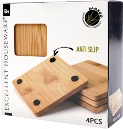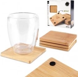 Et stilfuldt sæt med fire firkantede glasbrikker i bambustræ beskytter dit bord mod varme, fugt og ridser. Brikkerne måler 9,7 × 10 × 0,7 cm, er holdbare, miljøvenlige og står sikkert på plads takket være skridsikre puder. Perfekte til varme og kolde drikke og som en elegant borddekoration.