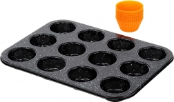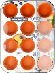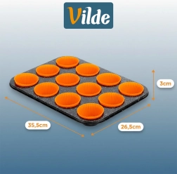 Denne granitform til 12 muffins er fremstillet af kvalitets kulstofstål med en non-stick belægning, som sikrer jævn bagning og nem udtagning uden at brænde fast. Sættet inkluderer 12 genanvendelige silikoneforme i orange – et fremragende miljøvenligt alternativ til engangspapirforme.