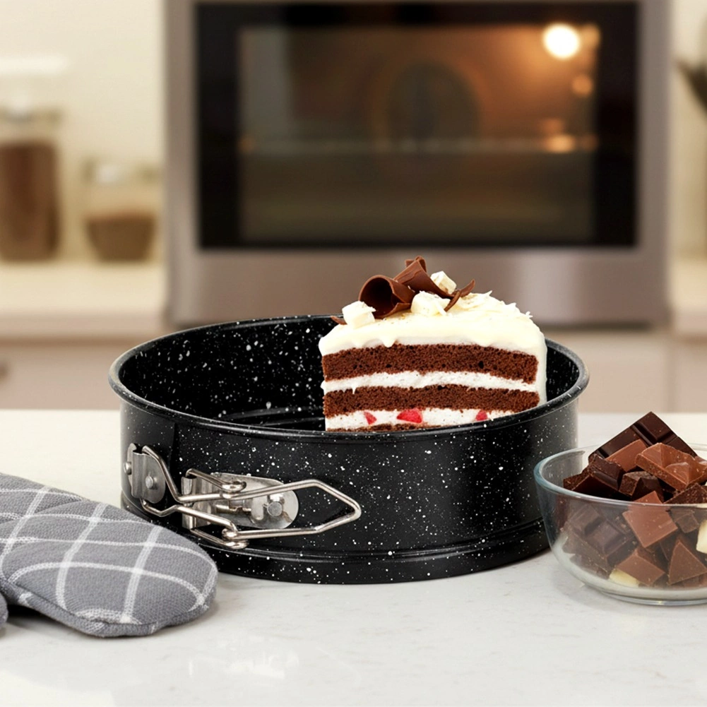 Den sideplacerede spænde åbner ringen, så kage eller cheesecake kan tages ud uden revner og uden at miste formen.