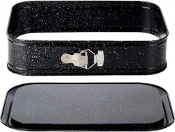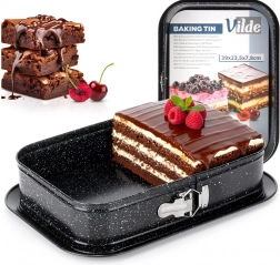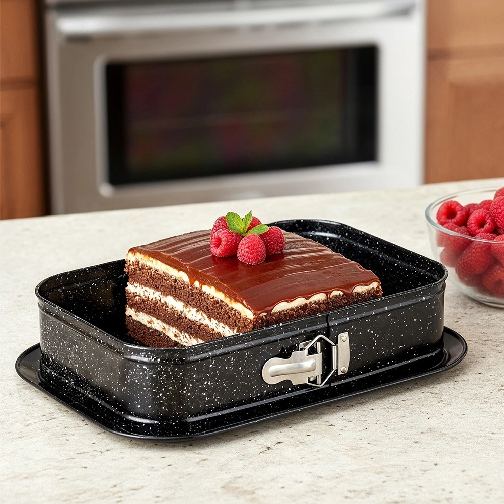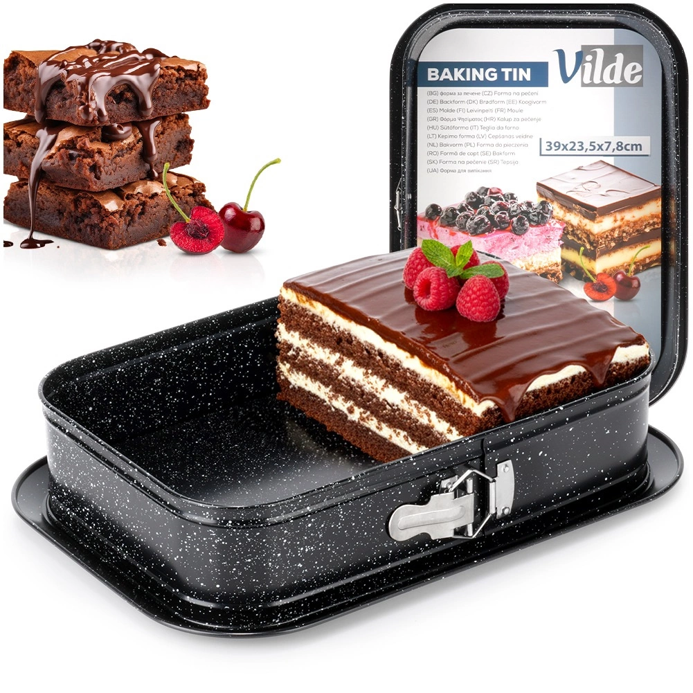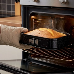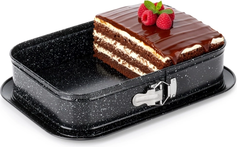 Den rektangulære springform er et fremragende valg til hverdagsbagning. Kulstofstål med granitbelægning tåler temperaturer op til 230 °C, absorberer ikke lugte og fordeler varmen jævnt takket være den gode varmeledningsevne. Den udløselige side og den aftagelige bund gør det problemfrit at tage selv skrøbelige desserter ud uden at ødelægge formen.