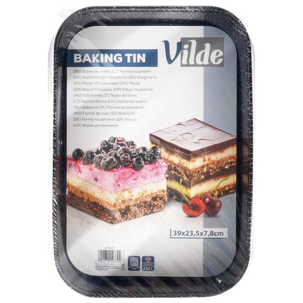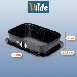 Mål: indvendigt 35 × 24 × 6,5 cm; udvendigt 39 × 27,5 × 8,5 cm. Kvalitetsforarbejdning for lang levetid og bekvem bagning både hjemme og til festlige lejligheder.