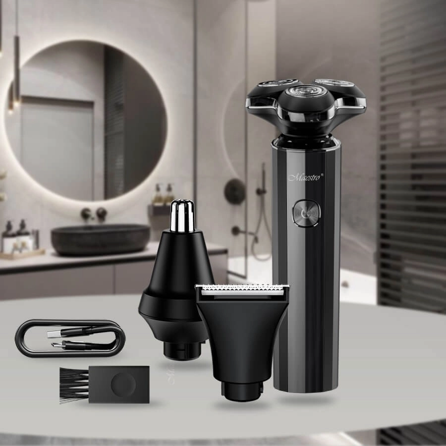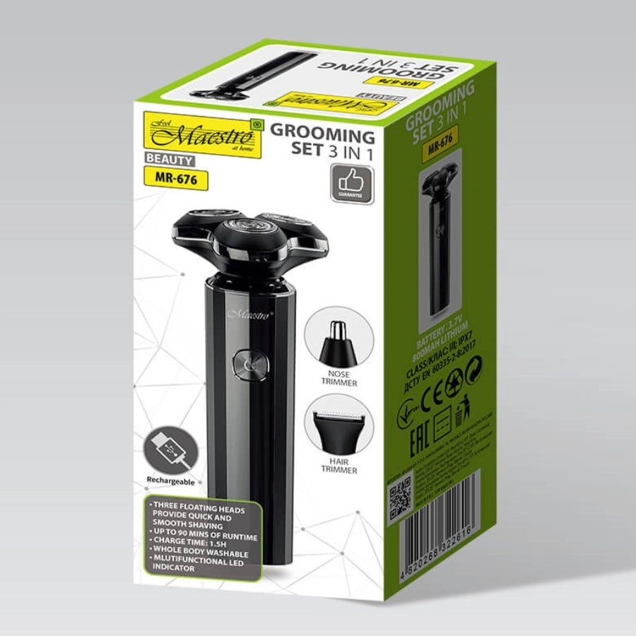 3‑i‑1 barbersæt USB‑C MR‑1676 Maestro er en praktisk løsning til komplet pleje af skæg og hår. Det kombinerer en kraftig barbermaskine, en præcis næse- og øretrimmer og en alsidig hårtrimmer med justerbare længder. Takket være det kapacitetsstærke lithiumbatteri på 800 mAh klarer den op til 90 minutters uafbrudt drift, og den oplades fuldt på blot 90 minutter via USB‑C.