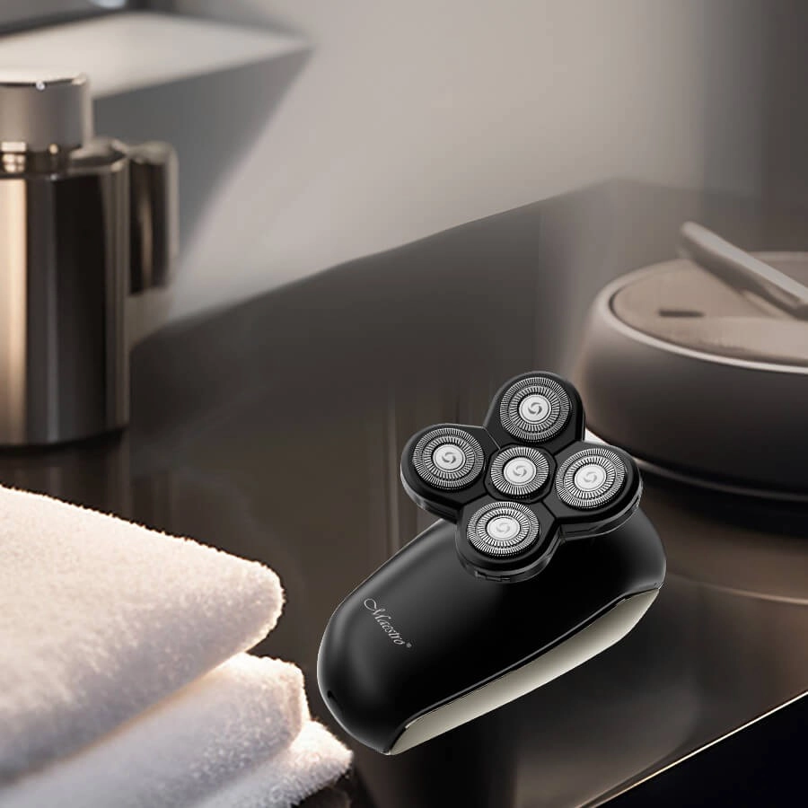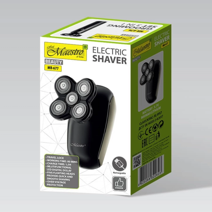 Maestro MR-677 er en pålidelig hovedbarbermaskine designet til hurtig og komfortabel glatbarbering. Takket være 5 bevægelige skærehoveder og et fleksibelt hoved følger den nøjagtigt hovedets og halsens konturer, minimerer irritation og forkorter barberingstiden. IPX7-vandtæt konstruktion muliggør både tør- og vådbarbering i brusebadet.