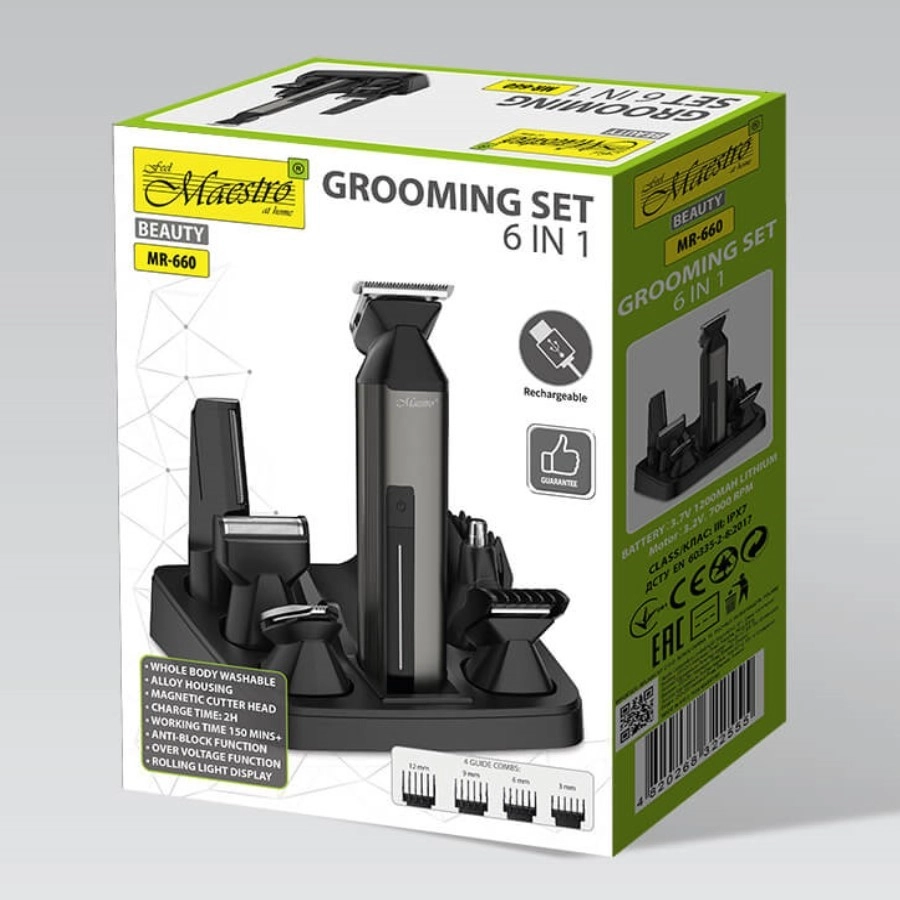 Det praktiske 6-i-1 hårklipningssæt MR-660 er designet til hurtig og præcis styling i hjemmets komfort. Takket være de mange tilbehør klarer du let grundlæggende klip, konturer og detaljerede justeringer. USB-strøm gør brugen fleksibel og opladningen nem.