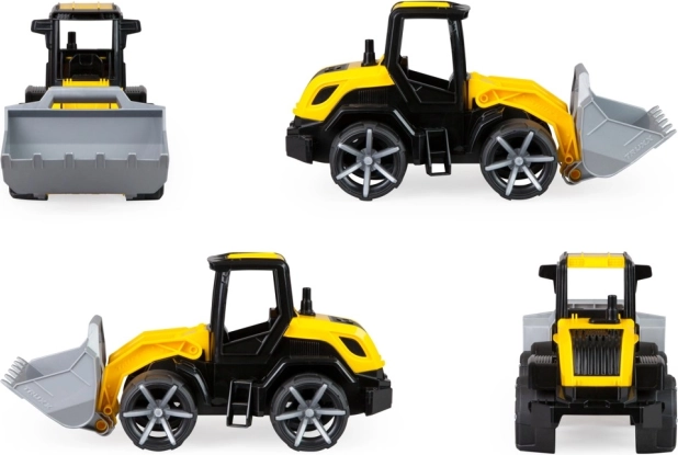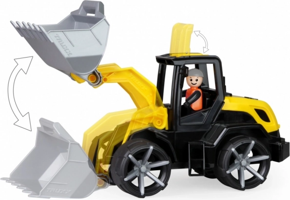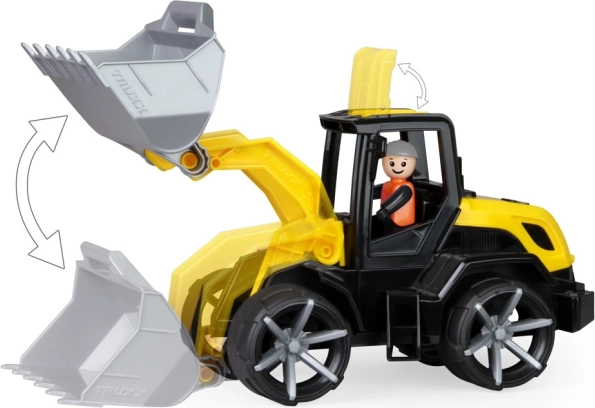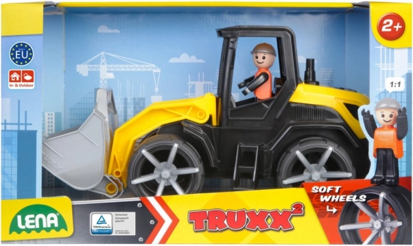 Robust børne-bulldozer LENA TRUXX 2 til leg både inde og ude glæder med bløde, stille hjul, åbningsbar kabine og bevægelig skovl med håndtag. Inkluderer førersfigur, robuste stålaksler og sikker udførelse. Fremstillet i Europa, TÜV-certificeret, egnet fra 2 år.