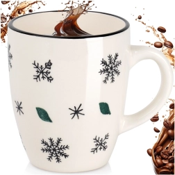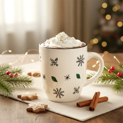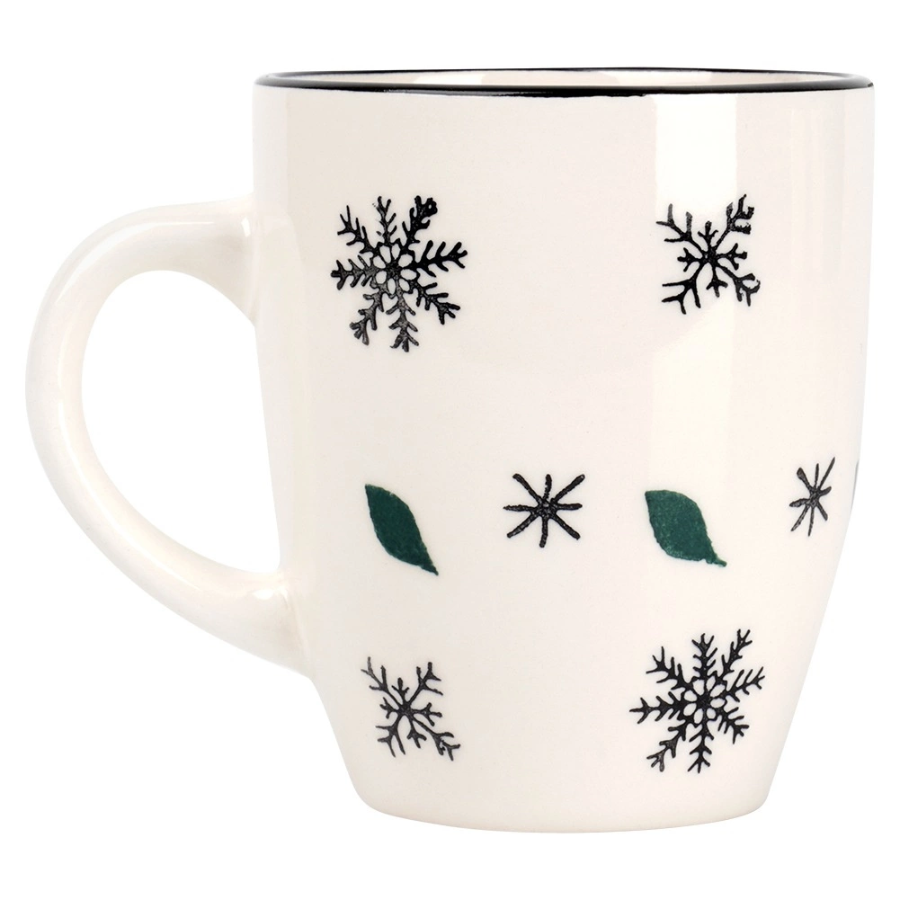 Stilfuldt keramikkrus med motiv af snefnug og en tynd sort kant, ideelt til daglig brug. Med en kapacitet på 350 ml, et behageligt håndtag og mulighed for opvaskemaskine og mikrobølgeovn kan du nyde te, kaffe eller varm chokolade når som helst. Det vinterlige design skaber en festlig stemning og egner sig også perfekt som gave.