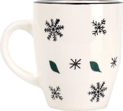 Gør det hyggeligt med et keramikkrus, der forvandler hver slurk til en behagelig vinterlig ritual. Den hvide overflade prydes af sorte snefnug og fine grønne motiver, fremhævet af en tynd sort kant for et elegant udtryk. Kruset har en universel form, ligger godt i hånden og passer problemfrit ind i din daglige rutine.
