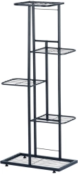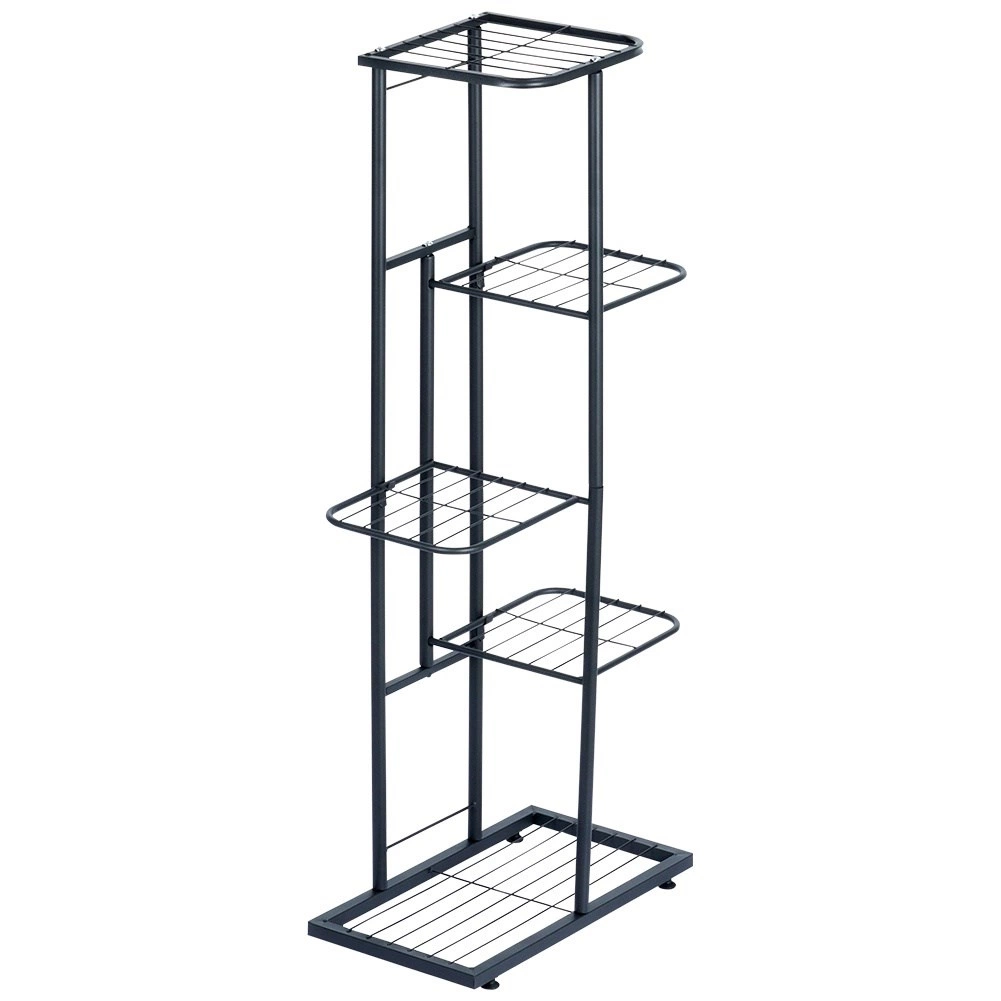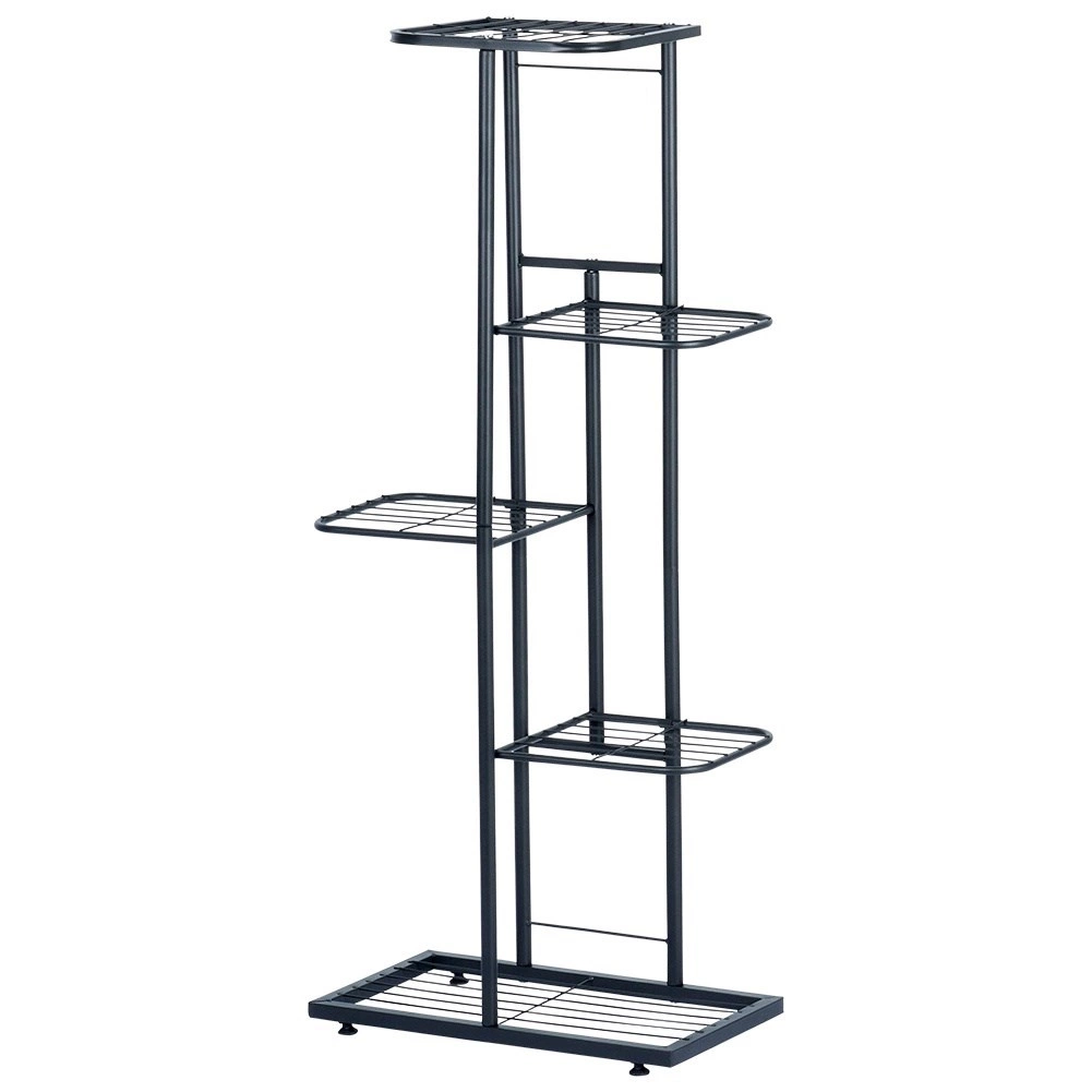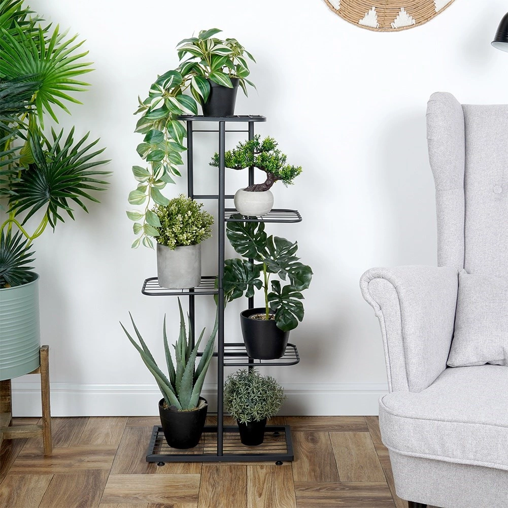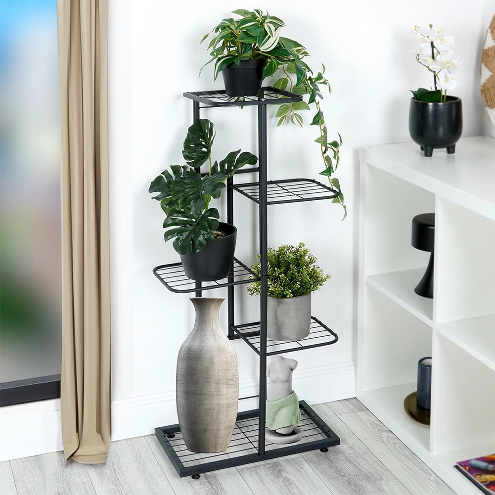 Denne elegante metal-blomsterreol med en højde på 96 cm giver fem separate hylder til overskuelig og effektfuld arrangering af stueplanter, kaktusser, klatreplanter samt dekorationer. Det matte sorte design i industriel loftstil passer nemt ind i en moderne stue, entré, kontor eller på en overdækket altan.