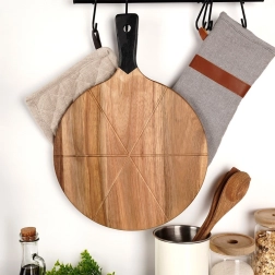 Akacietræ modstandsdygtigt over for fugt, rustfri pizzaskærer med træhåndtag og praktisk håndtag på brættet med hul til ophæng.