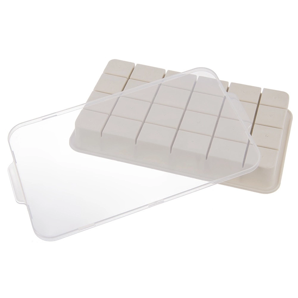 Det gennemsigtige låg gør håndteringen nem – vandet løber ikke ud under transport, og isen beskyttes mod uønskede lugte. Det bløde, fleksible materiale sikrer nem frigørelse af terningerne uden at formen revner eller vrides.