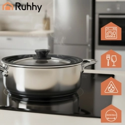 Praktisk 3 i 1-låg fra RUHHY erstatter tre almindelige låg. Takket være tre diametre 28/30/32 cm passer det perfekt til pander, gryder og woks, sparer plads og gør madlavningen enklere. Kombinationen af varmebestandigt glas og silikonekant sikrer holdbarhed, tæthed og sikker brug. Med dampspænde/udluftningshul mod overkogning og ergonomisk greb for behageligt hold.