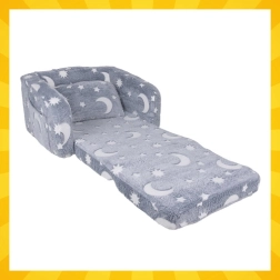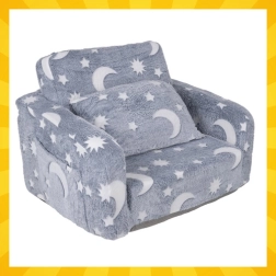 Blød komfort og sjov i ét – den sammenklappelige børnestol fra Kruzzel bliver nemt til en chaise longue til læsning, afslapning og godnathistorier. Superlet, sikker og nem at bære, med praktisk sidetaske og blød plysbetræk. Fluorescerende måner og stjerner lyser blidt i mørket og skaber en beroligende atmosfære til rolig indslumring.