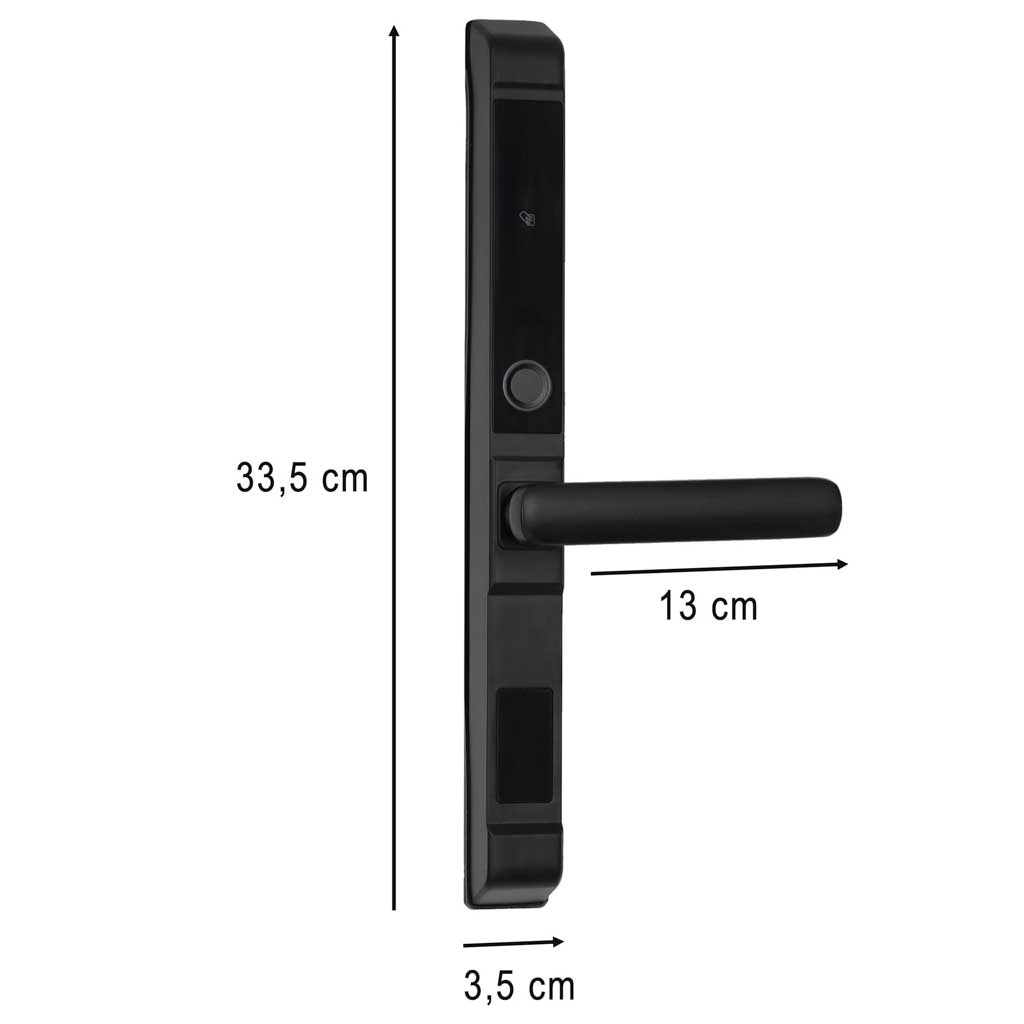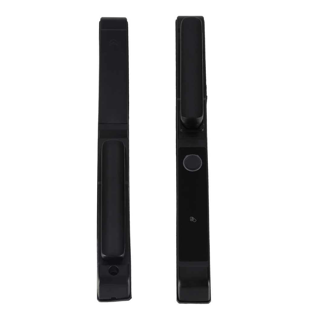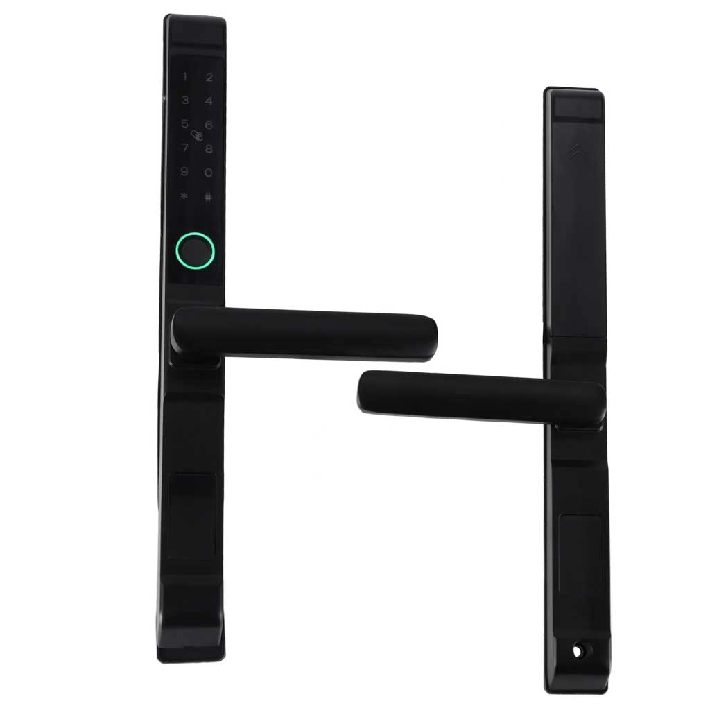 Moderne smart dørlås med touch-tastatur, fingeraftrykslæser og MIFARE-kort, der tilbyder nøglefri adgang, styring via mobilapp og Wi‑Fi/Bluetooth-forbindelse. Takket være flere oplåsningsmetoder, alarm ved forkert kode og muligheden for at indtaste tilfældige tal før/efter adgangskoden giver den et højt sikkerhedsniveau til både indvendige og indgangsdøre.