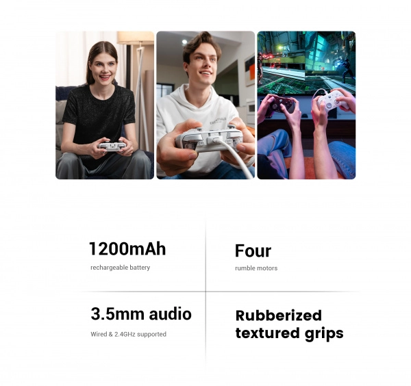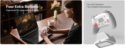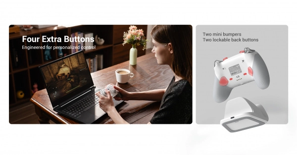 Til krævende spillere tilbyder den optiske mikrokontakter på ABXY, en præcis mekanisk D‑pad, to mini-bumpers R5/L5, to bageste programmerbare knapper R4/L4 og en kortslagstilstand for udløsere til hurtige FPS-aktioner. Forbedret haptik med fire motorer leverer intens feedback i greb og udløsere. En praktisk ladestation medfølger for nem opladning og opbevaring.