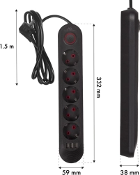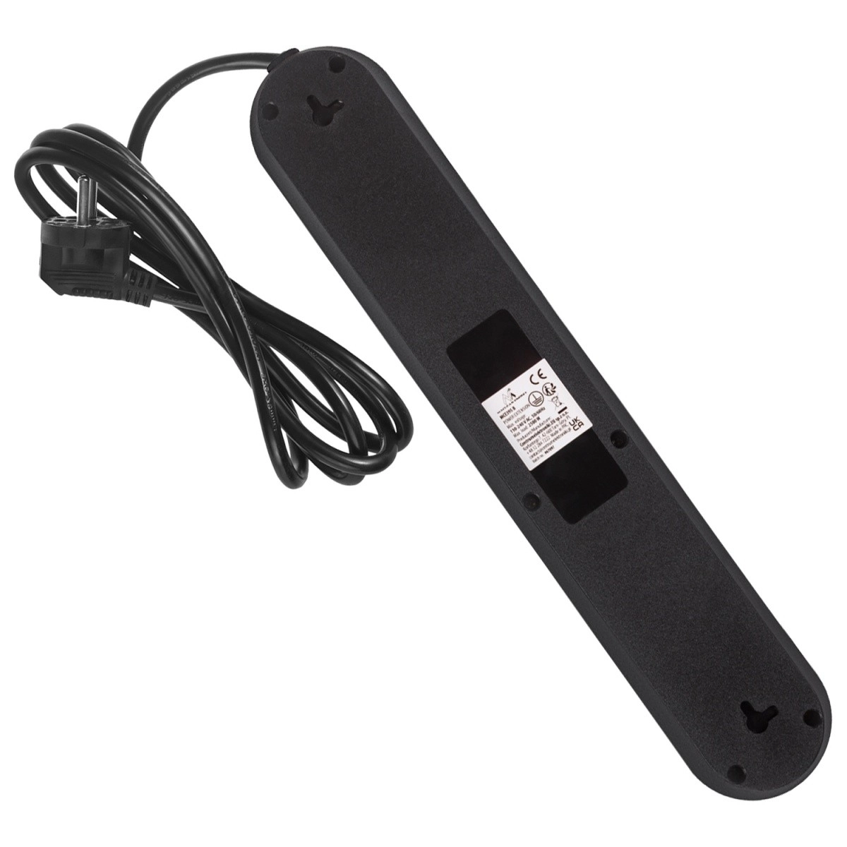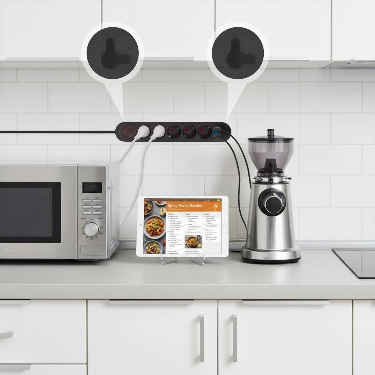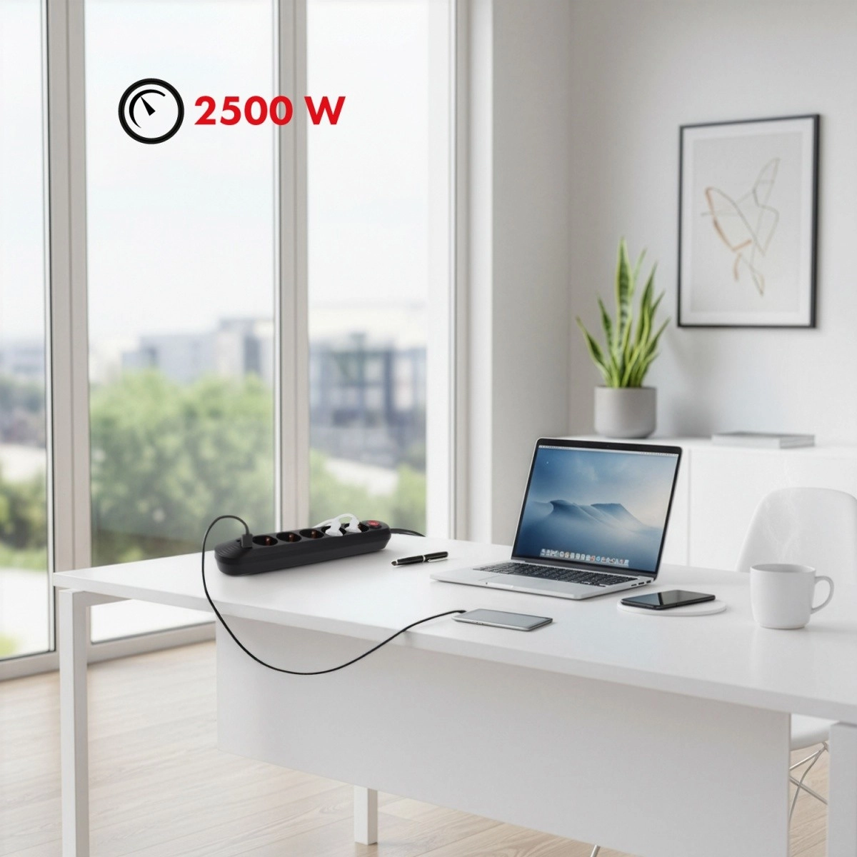 Denne kompakte og robuste strømskinne kombinerer klassiske stik med indbygget USB-opladning, så du sparer både plads og adapter. Det brede inputområde på 110–240 V AC (50/60 Hz) sikrer drift under forskellige forhold, og maksimal belastning på 2500 W dækker de fleste husholdningsapparater.