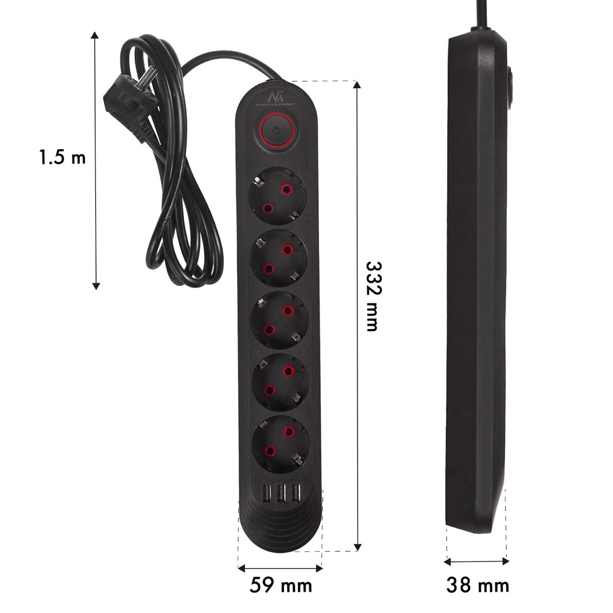 Fem Schuko-stik og tre USB-porte gør det muligt at forsyne apparater med strøm og samtidig oplade telefoner, tablets eller høretelefoner – uden behov for separate adaptere.