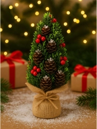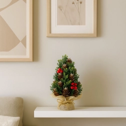 Det elegante mini juletræ er et ideelt valg for dem, der vil pynte hjemmet hurtigt og effektfuldt. Tætte grønne grene suppleres af naturlige kogler og markante røde bær, som giver dekorationen et naturligt og højtideligt udtryk. Den juteindpakkede base understreger den rustikke stil og gør det let at matche med resten af julepynten.