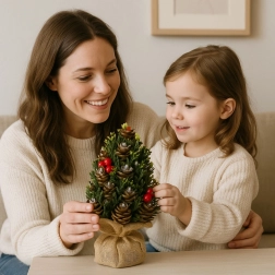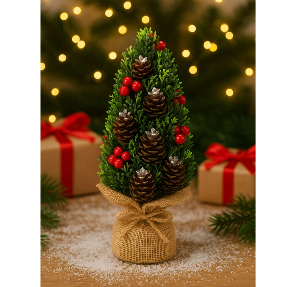 Gør adventstiden hyggeligere med en stilfuld dekoration: et mini juletræ med realistisk grønt, naturlige kogler og røde bær. Takket være de kompakte mål, den stabile, vægtede base og det rustikke juteomslag passer det til både bord, hylde og reception og skaber øjeblikkeligt en festlig atmosfære.
