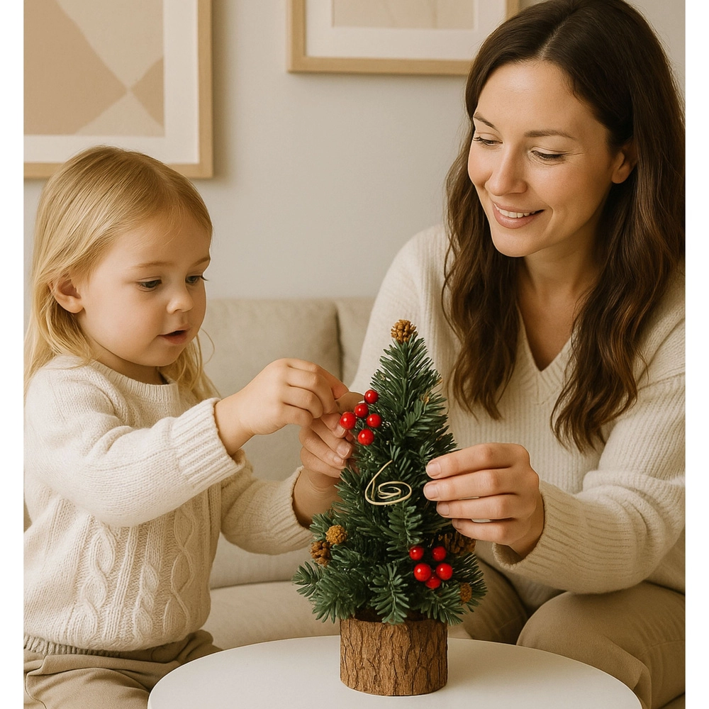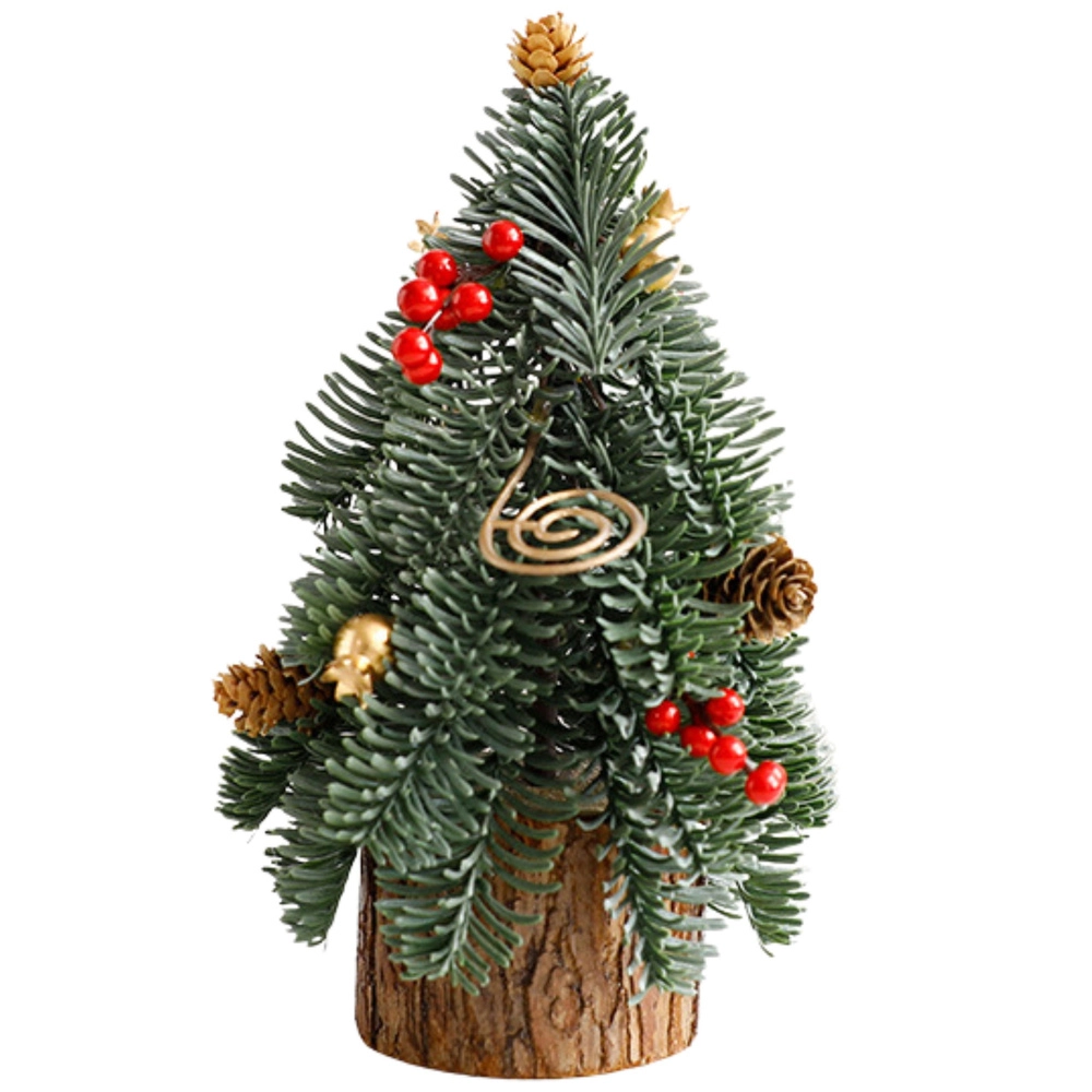 Kompakt dekorativt juletræ på en naturlig træstamme, kendetegnet ved realistiske nåle, røde bær, kogler og gyldne accenter. En stabil træbase og mål på 26 × 12 cm gør det til en ideel borddekoration til hjem, kontor eller butik. Den holdbare udførelse gør det muligt at bruge det i mange sæsoner.