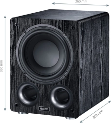Det robuste kabinet i MDF fås i finish sort ask eller mokka. Takket være de kompakte mål placeres den nemt selv i mindre rum, og den aftagelige stofgrill understreger det rene design. Et ideelt valg som subwoofer til hjemmebiograf og stereo på tværs af mærker.