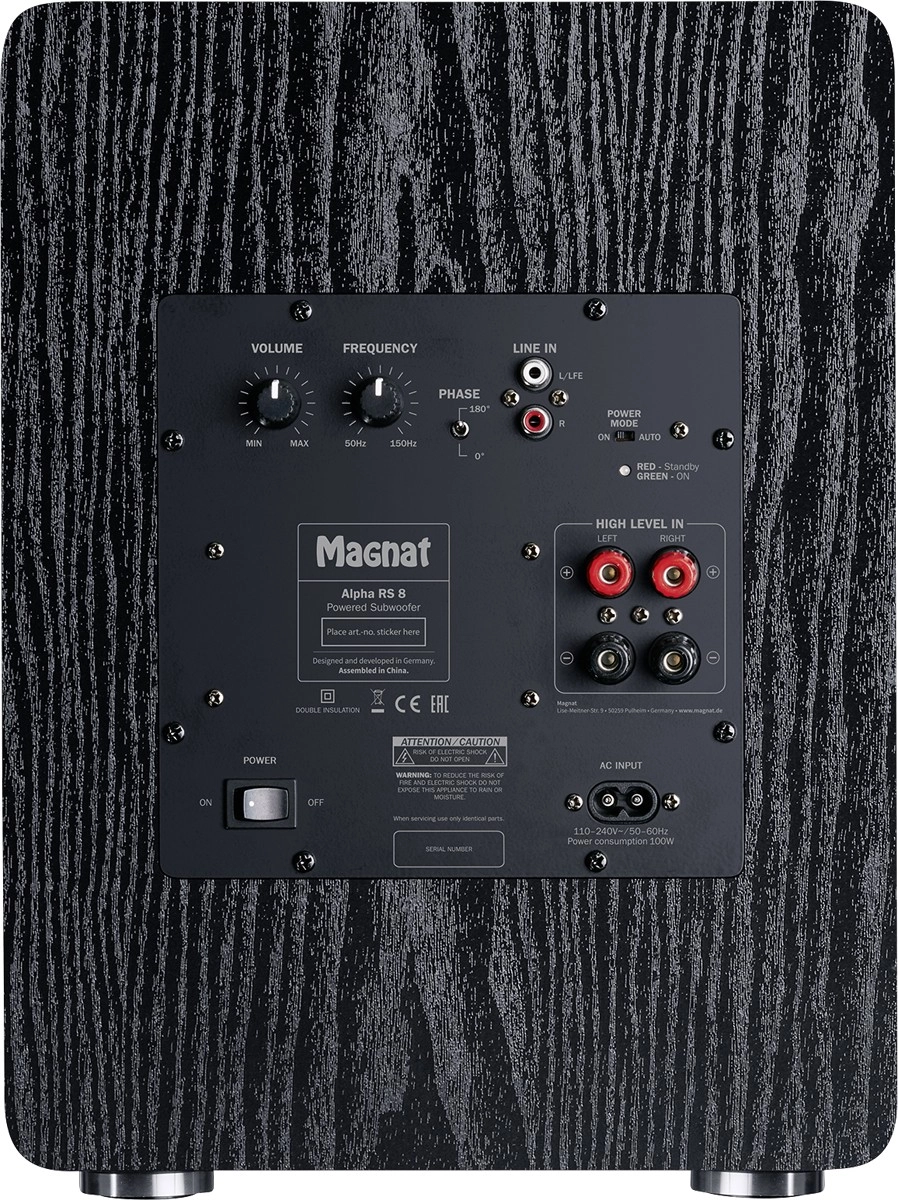 Magnat Alpha RS 8 er en kraftfuld og samtidig pladsbesparende subwoofer til hjemmebio og hi-fi. Takket være den integrerede klasse D-forstærker leverer den 80 W RMS og op til 160 W spidseffekt. Den 200 mm (8") basenhed med belagt papirmembran og Klippel-optimeret magnetsystem sikrer hurtig respons og dyb, kontrolleret bas.