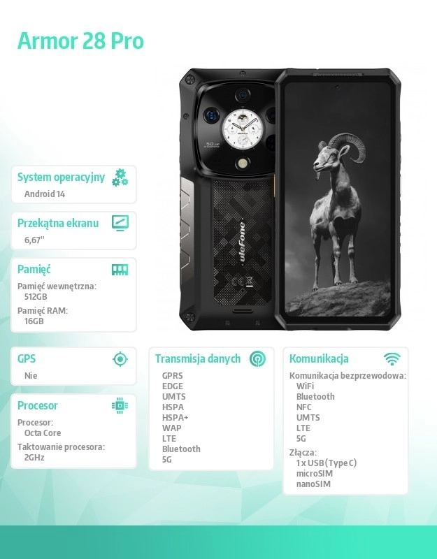 Ulefone Armor 28 Pro 5G er en førsteklasses robust telefon til arbejde og eventyr i felten. Den tilbyder en 6,67" AMOLED 120 Hz-skærm med lysstyrke på 2200 nits og Gorilla Glass Victus-beskyttelse, ekstrem holdbarhed IP68/IP69K/MIL‑STD‑810H, hurtig MediaTek Dimensity 7300-chip, hukommelse 16 GB RAM + 512 GB med udvidelse op til 2 TB, kraftigt 10.600 mAh batteri med 120 W opladning og avanceret kamerasystem 50+50+64 MP samt 50 MP selfie.