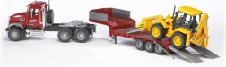 Dette detaljerede sæt kombinerer den robuste MACK-trækker med en lavlæssersættevogn og den alsidige læssemaskine JCB 4CX. Takket være den præcise skala 1:16 og de funktionelle elementer får børn en autentisk legeoplevelse – fra lastning til transport af byggemaskiner. Modellerne er designet til intensiv leg og fungerer også som flotte udstillingsstykker.