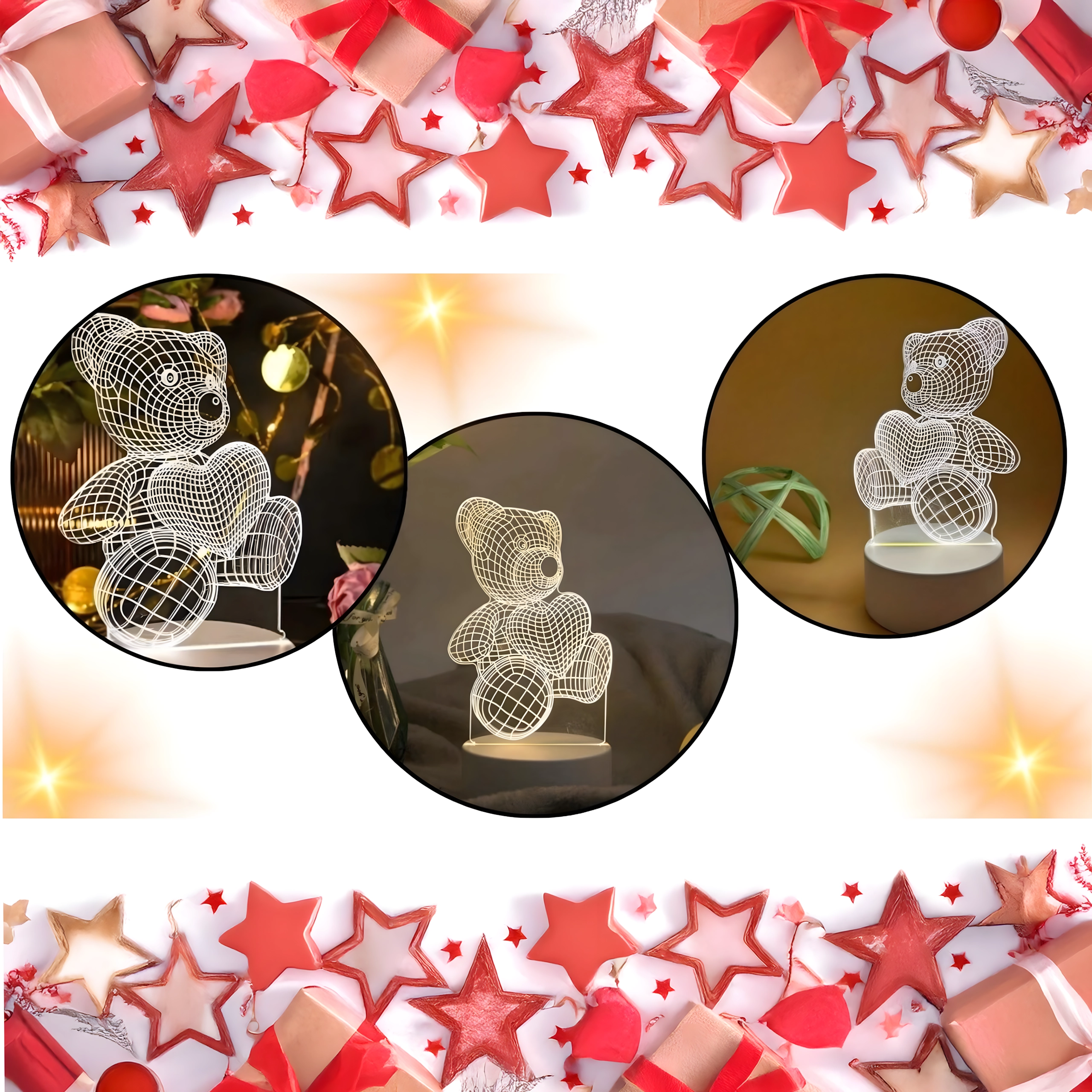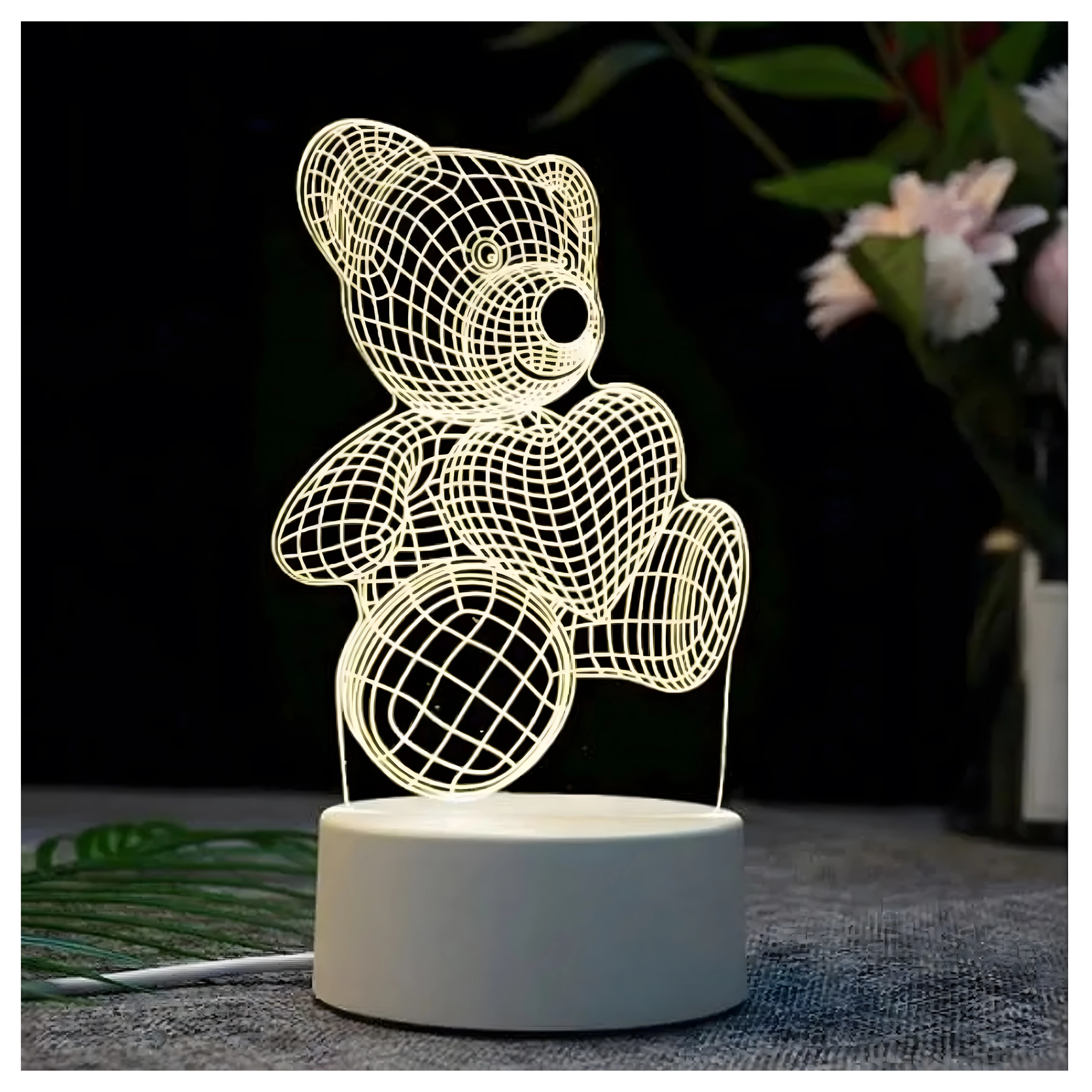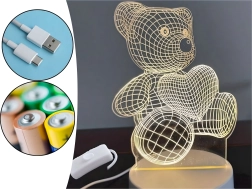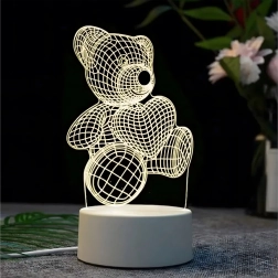 Denne dekorative natlampe i form af en bjørn, der holder et hjerte, bruger klar akryl med graveret gitter, som ved tænding skaber en realistisk 3D-effekt. Takket være det bløde, beroligende lys er den ideel til børns indsovning, aftenlæsning eller diskret belysning af hylder og borde.