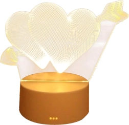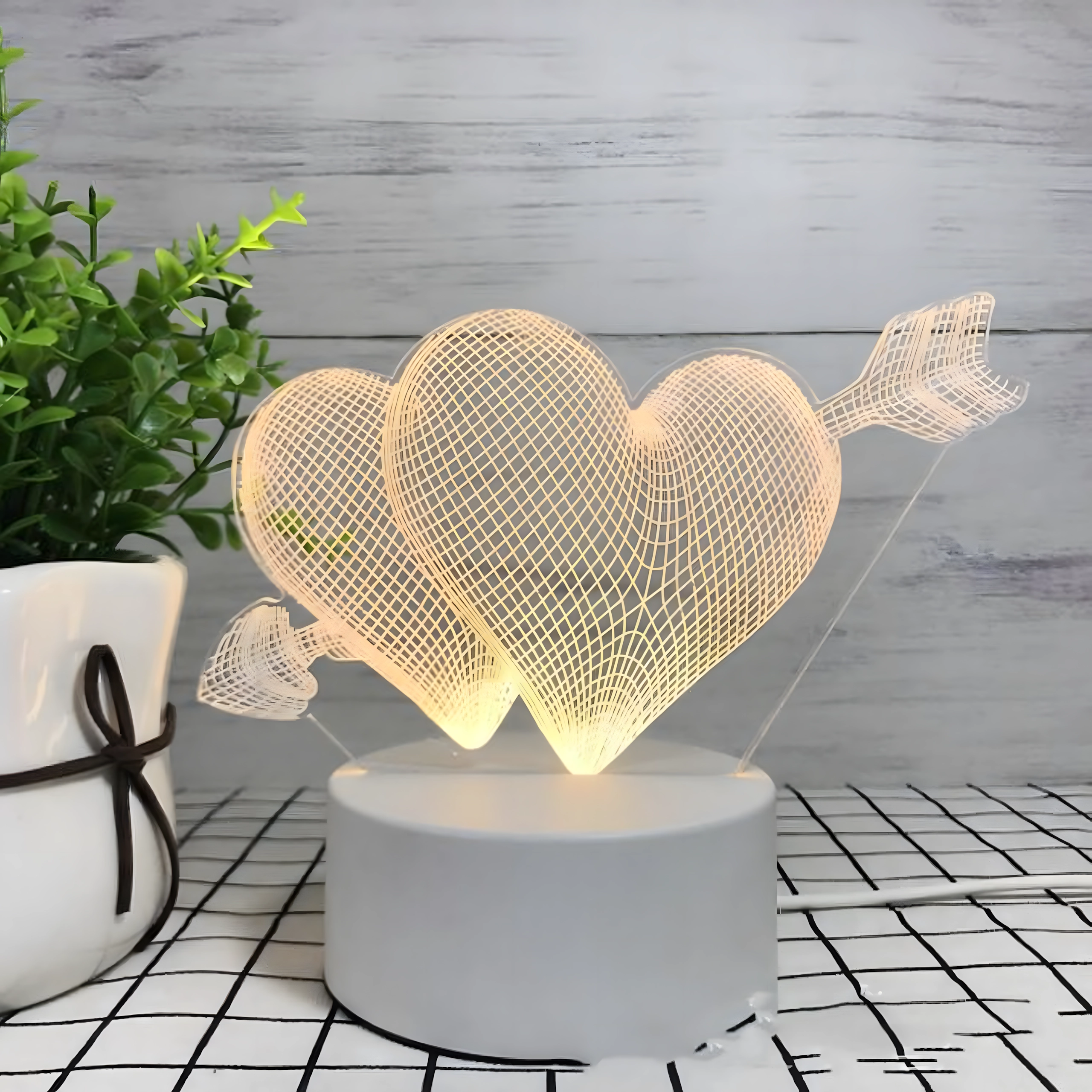 Giv interiøret liv med et magisk lysspil. Lampen med to sammenflettede hjerter og pil tegner en subtil 3D optisk illusion, som gør sig godt i soveværelset, børneværelset og stuen. Takket være den kompakte base og den behagelige, varme tone er den ideel til aftenafslapning og som beroligende natlys.