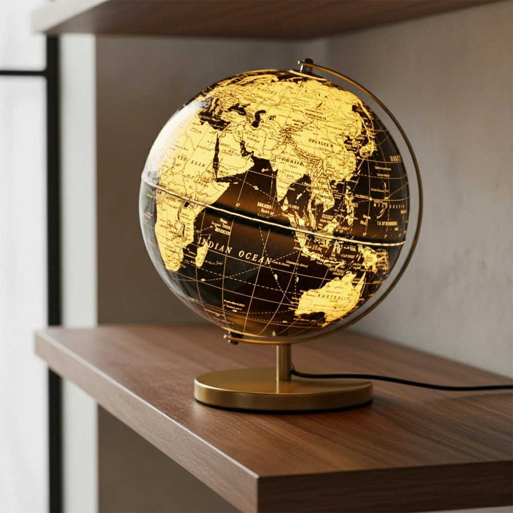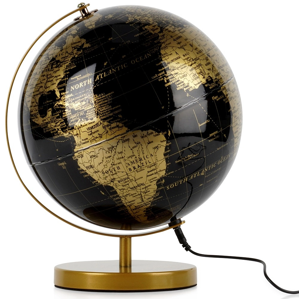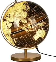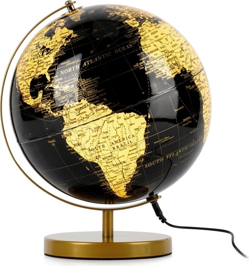 Elegant bordlampe formet som en globus i målene 26 × 25 × 31 cm, som bringer både stil og funktionalitet til indretningen. Kombinationen af sort og guld, den stabile metalbase og varmt hvidt LED-lys skaber en behagelig atmosfære til både afslapning og arbejde. Lampen har USB-strømforsyning med en 1 m lang kabel og en skridsikker filtunderlag til at beskytte møblerne.