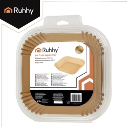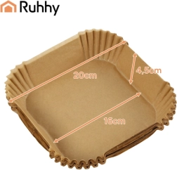 Hold din airfryer perfekt ren med RUHHY papirindsatser. Sættet indeholder 100 engangsindsatser af siliconiseret papir til non-stick bagning, med varmeresistens op til 230 °C og en universel firkantet form 20 × 20 × 4,5 cm (bund 16 × 16 cm). Mindre rengøring, mere smag – ideel til pommes frites, kød og bagværk.